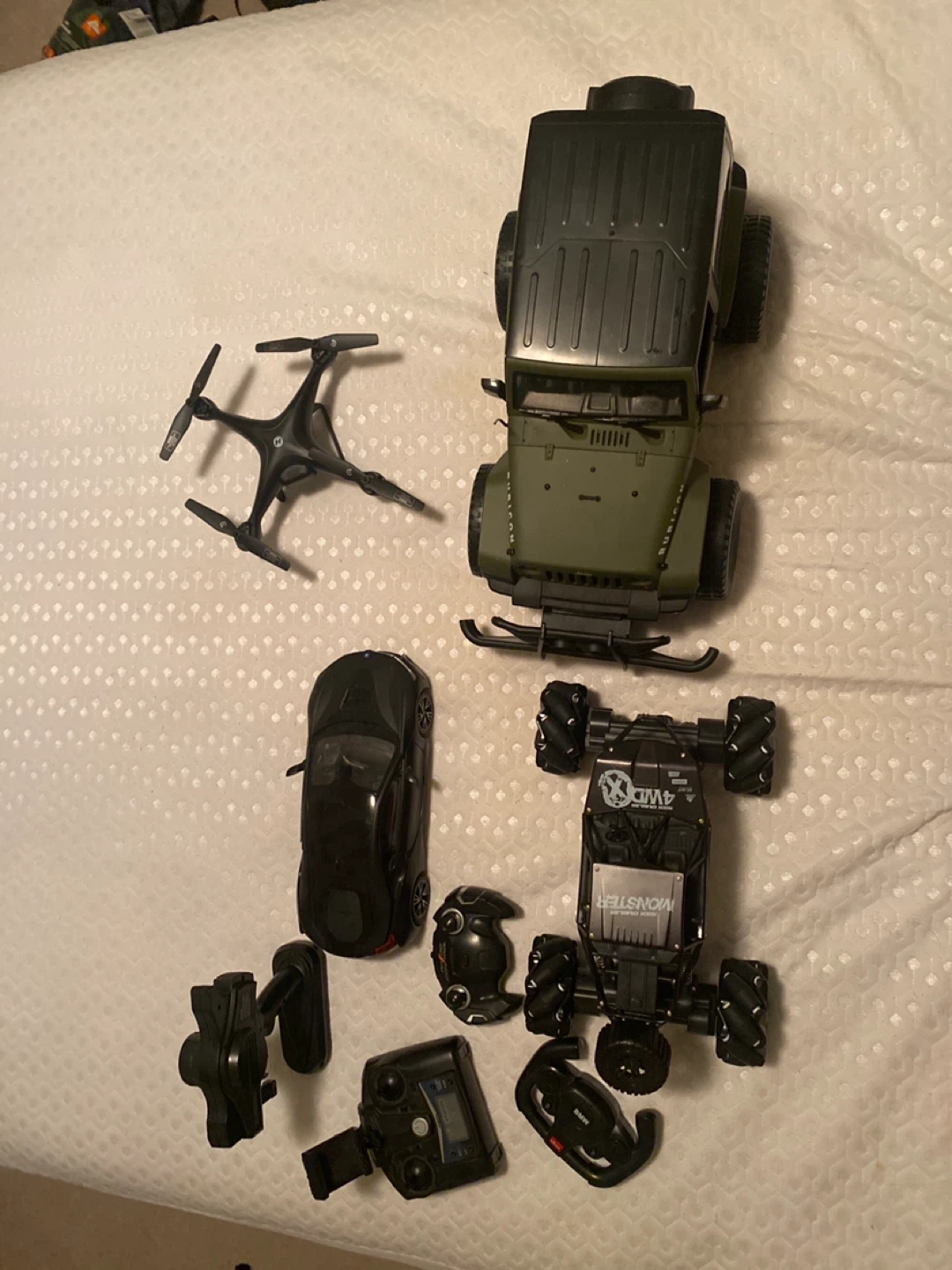 Selling a variety of RC vehicles! There's a drone, a Jeep Rubicon, a Rock Crawler Monster, and a BMW i8. All in good condition and ready for some fun