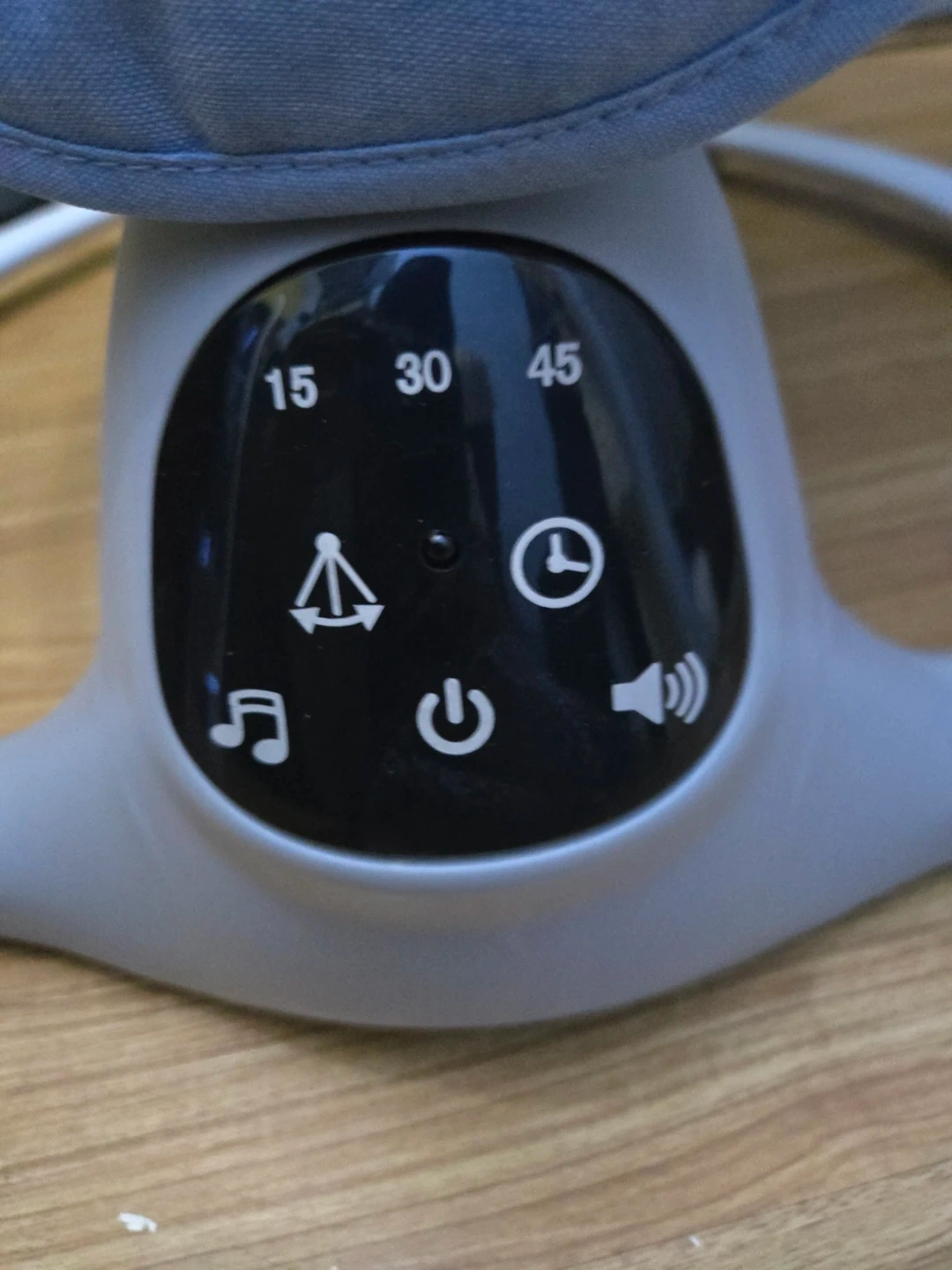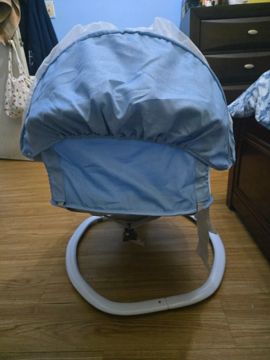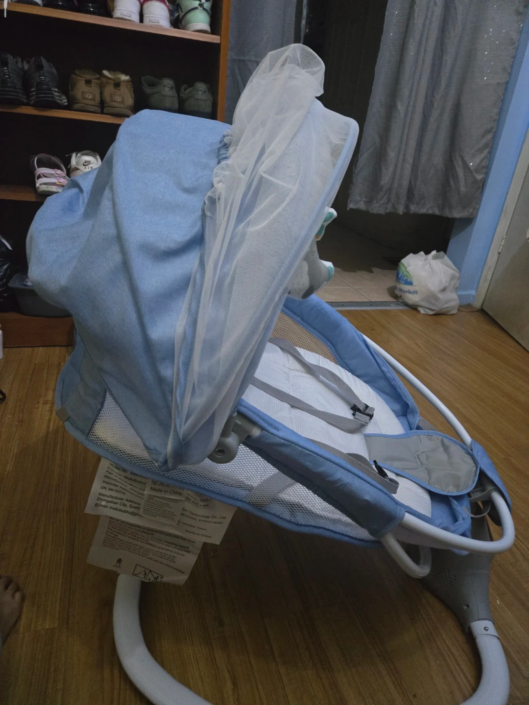 This is a blue baby swing with a canopy and hanging toys. It comes with a USB power cable. The swing has adjustable straps for safety. It's great for keeping babies entertained and soothed.