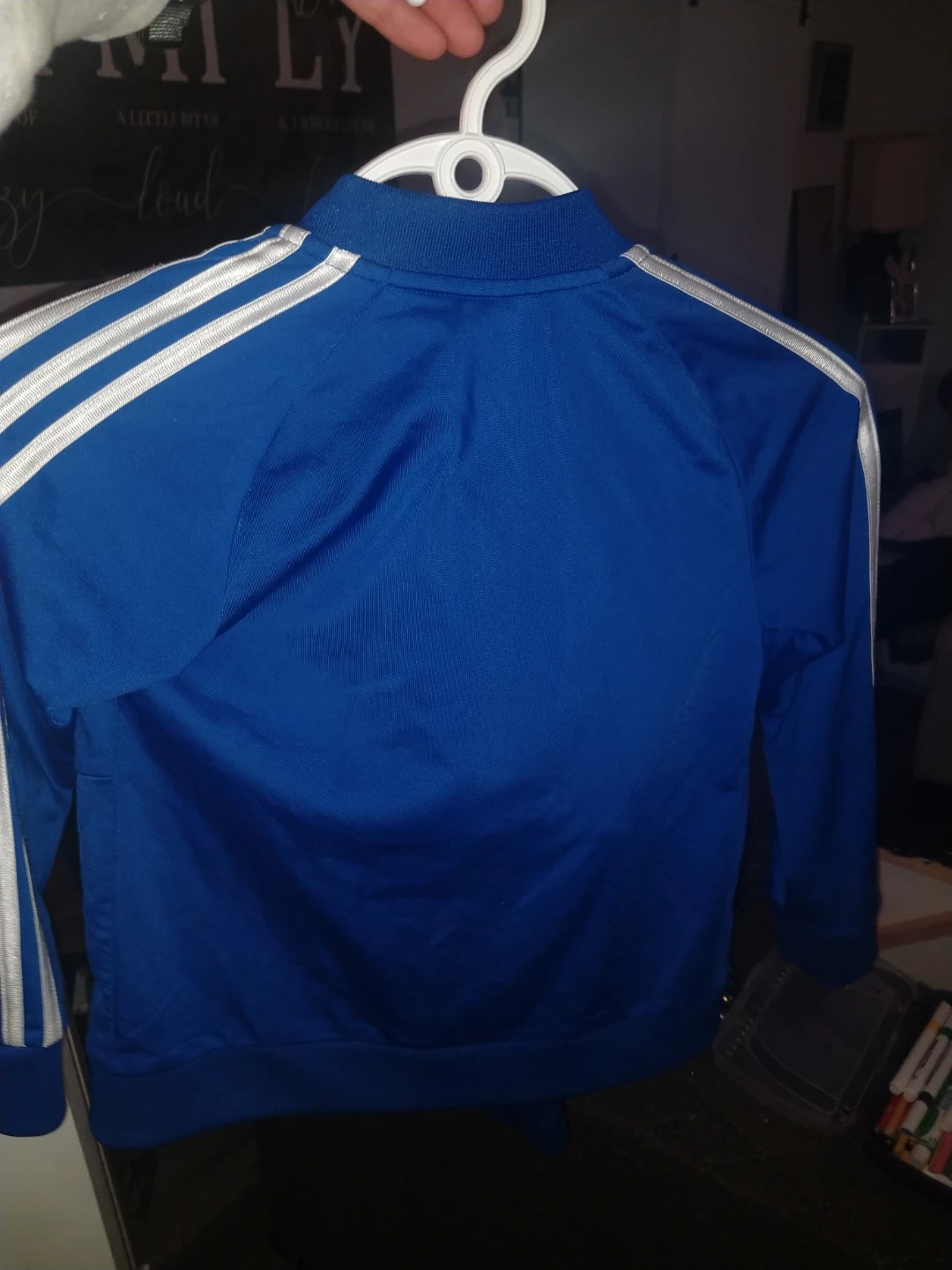 This is a childrens blue Adidas track jacket with white stripes on the sleeves. It's a full-zip style. Classic athletic wear!