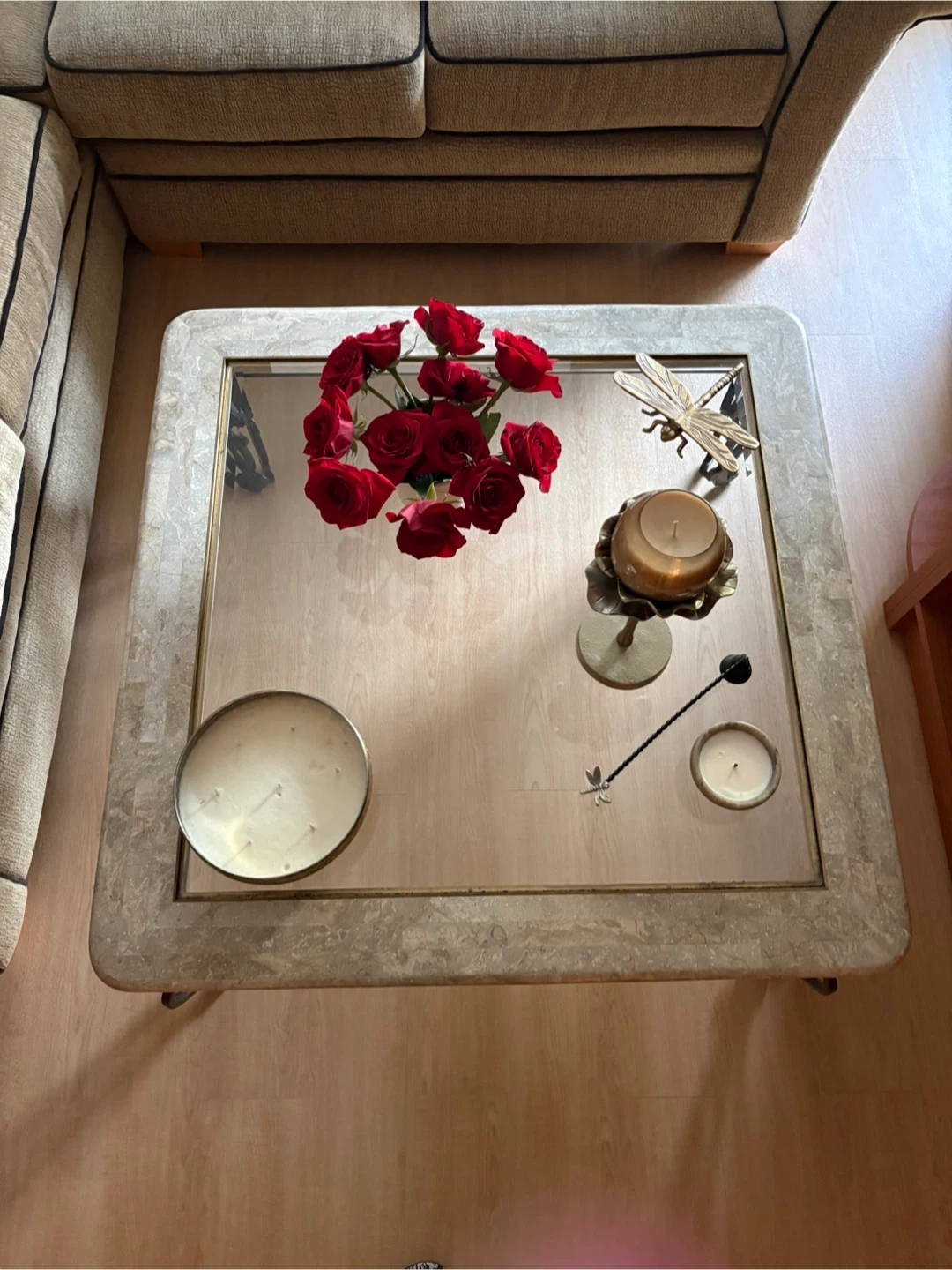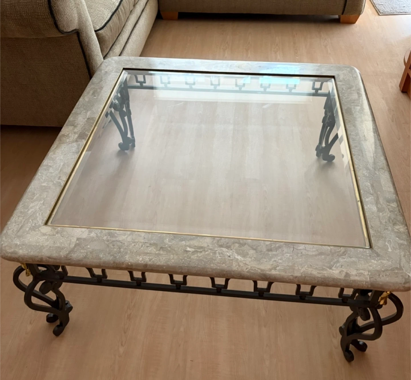 Stylish square coffee table featuring a clear glass top with a decorative marble-look inlay border. It's supported by an ornate black metal base with scrolled legs. This table's unique design makes it a great accent piece for any living room. Just moved to small apartment and don't fit in my living room 😏.