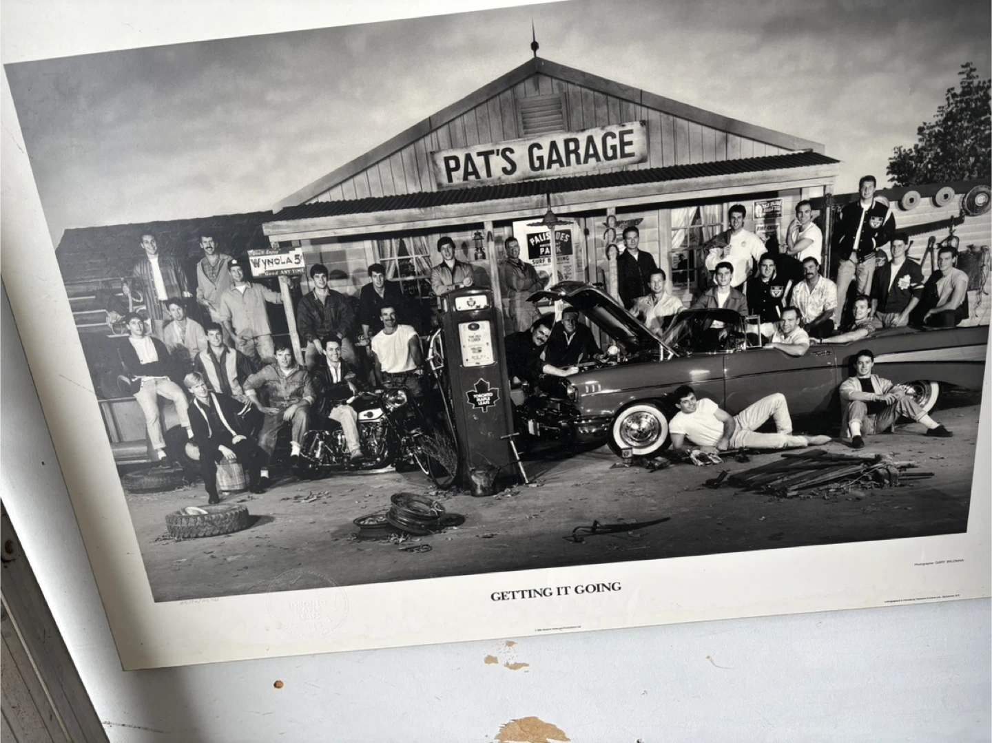 This is a vinegare print titled "Getting It Going" from Pat's Garage. It depicts a scene with a group of young men gathered around classic cars and motorcycles. The print showcases a nostalgic automotive garage setting.
