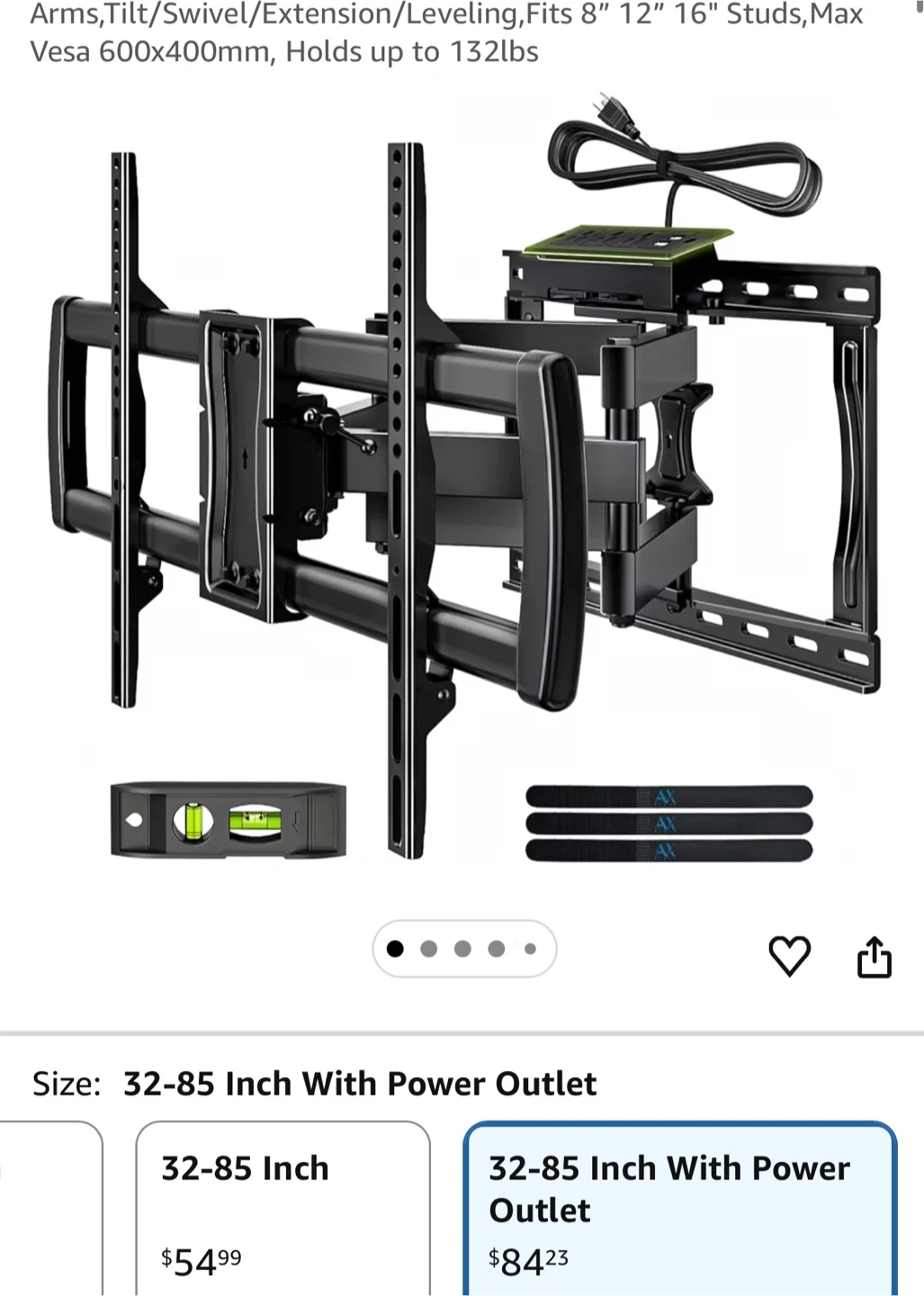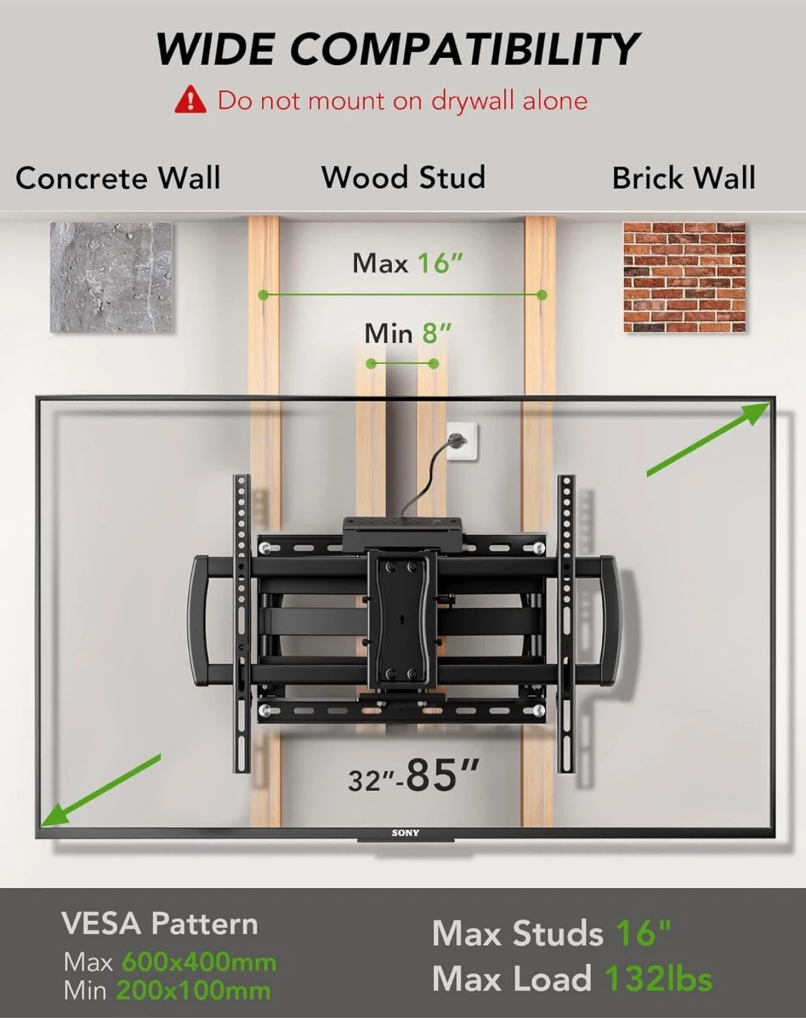 Full Motion TV Wall Mount Bracket with Power Outlet for Most 32-85 inch TV,TV Mount Dual Articulating Arms,Tilt/Swivel/Extension/Leveling,Fits 8” 12” 16" Studs,Max Vesa 600x400mm, Holds up to 132lbs