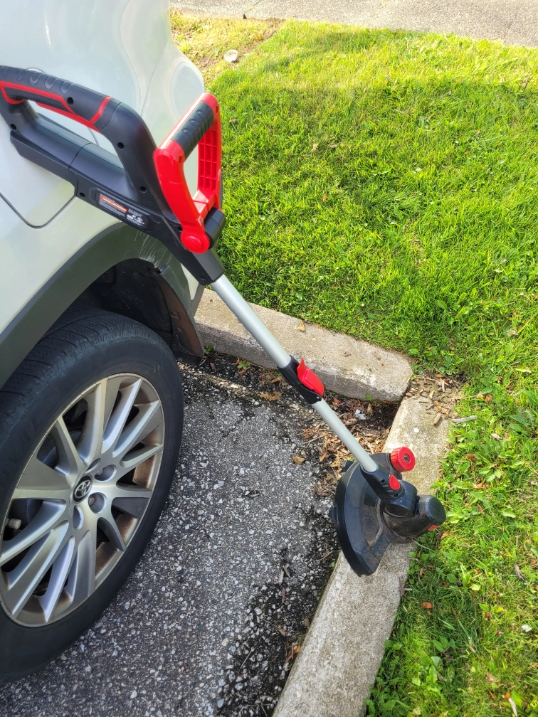 used once . Selling a Weed Eater cordless string trimmer. It's in good condition and ready to help you tidy up your lawn! The trimmer features a red and black handle, and a silver shaft. It is cordless, making it easy to maneuver around your yard