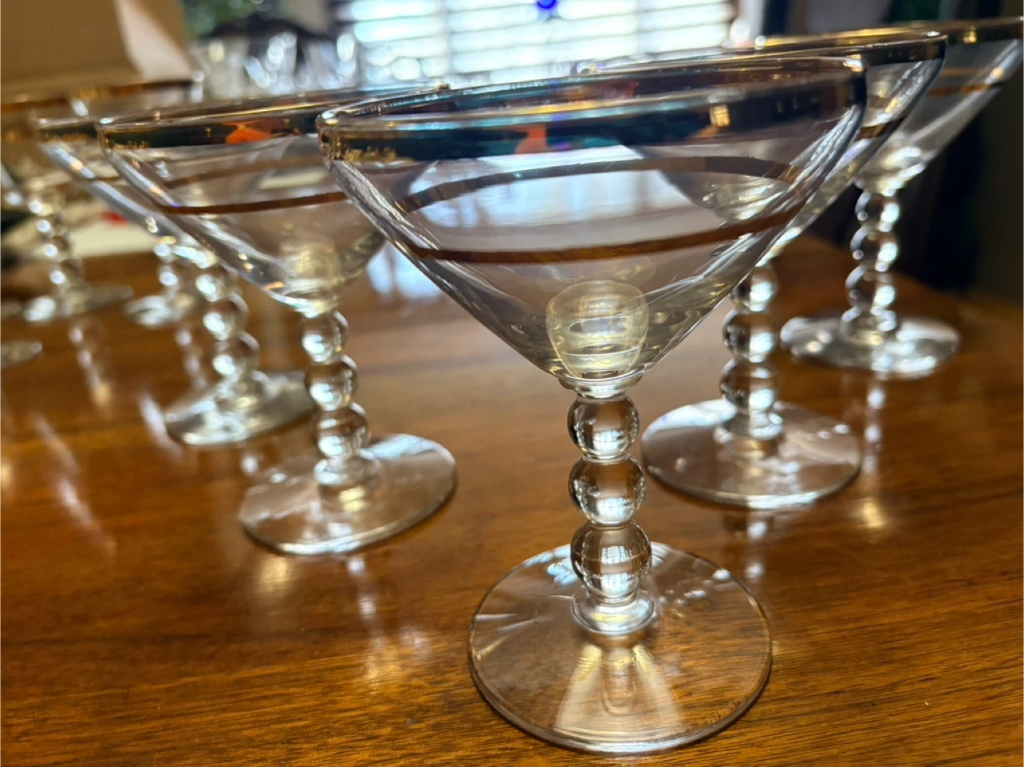 This is a set of vintage wine glasses with a delicate gold rim and a unique beaded stem. They're perfect for serving wine or cocktails at special occasions. Glass material.
