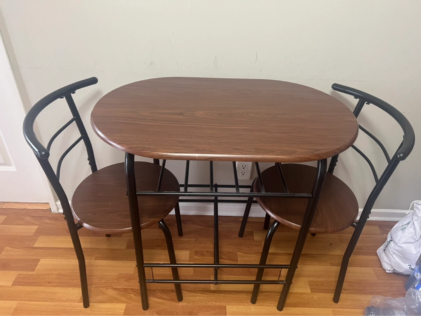 Compact dining set with a wood-grain tabletop and matching chair seats. Black metal frame. It's a two-chair set, perfect for small spaces. Sturdy metal legs.