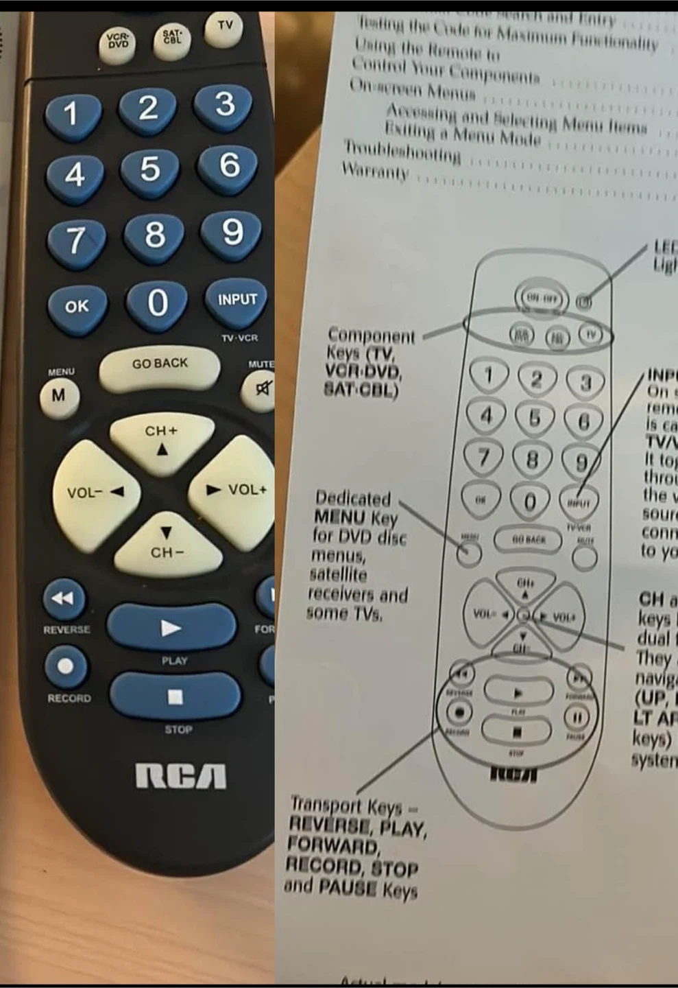 91Selling an RCA universal remote. It has dedicated menu keys for DVD disc menus, satellite receivers, and some TVs. Also features transport keys for reverse, play, forward, record, stop, and pause functions. Perfect for controlling your TV and other devices!