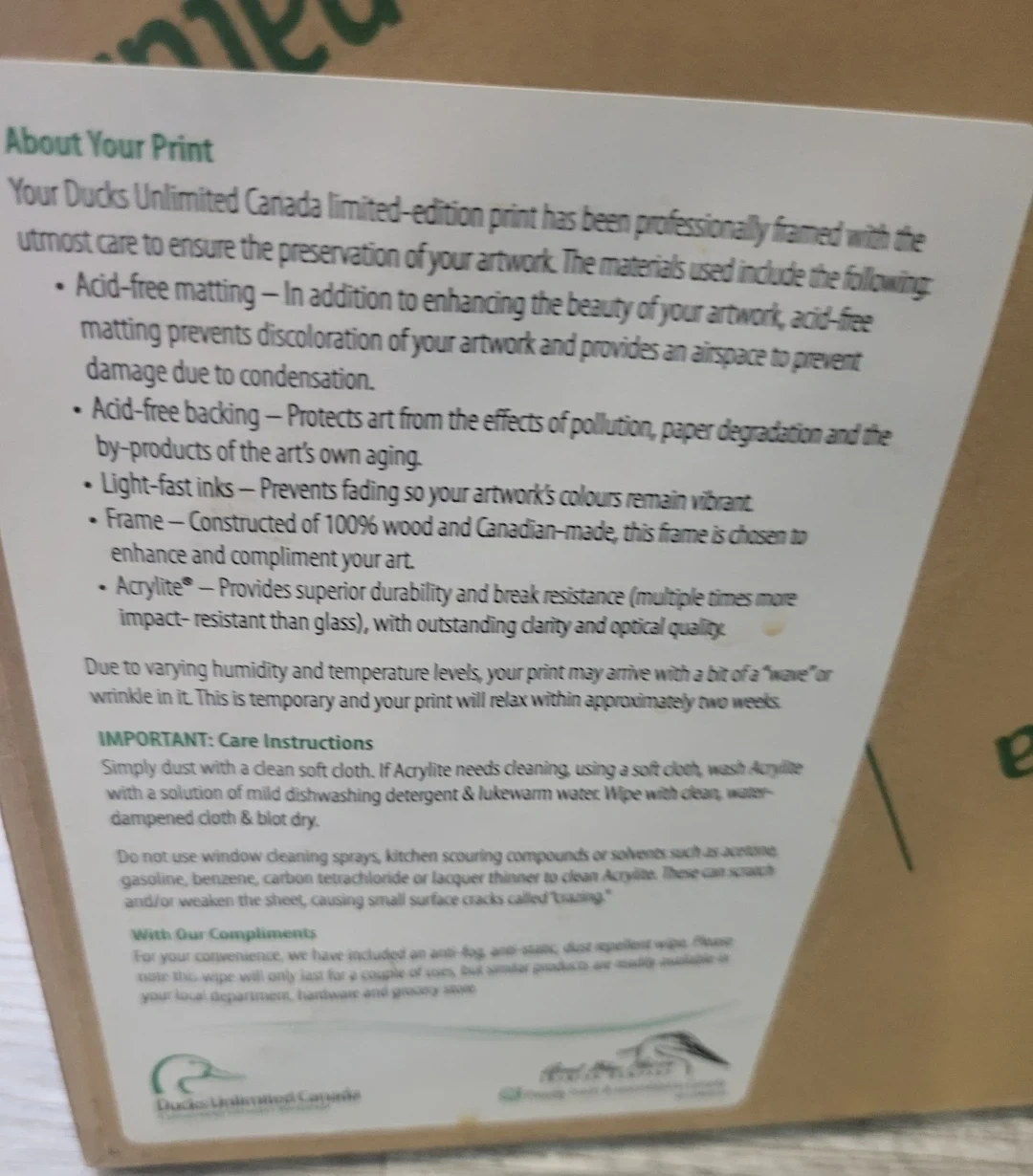 Professionally framed limited edition print from Ducks Unlimited Canada. Features acid-free matting and backing, with light-fast inks for vibrant, preserved colours. The frame is constructed from 100% wood and Canadian-made. This print was artist Darren Haley's Artist of the Year 2010 selection.