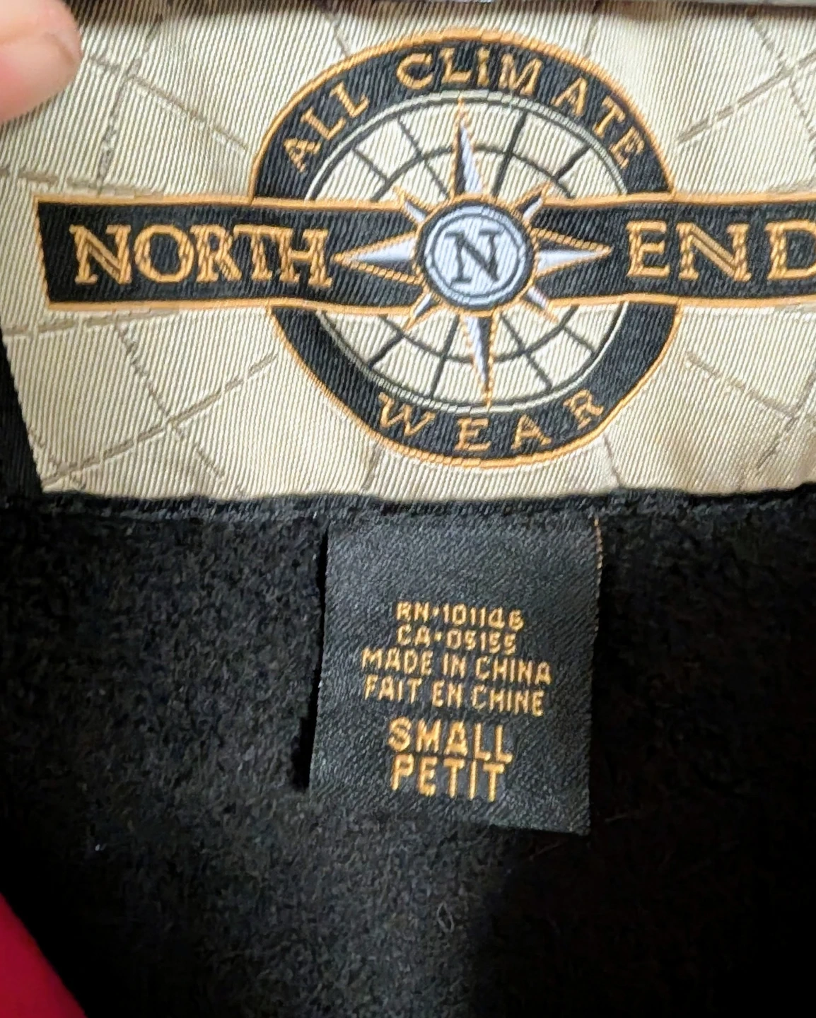 This is a red jacket from North End Wear. It's a size small. It features the "EzeM System" and the name "Nurissa" embroidered on the sleeve and Assante on front left chest.