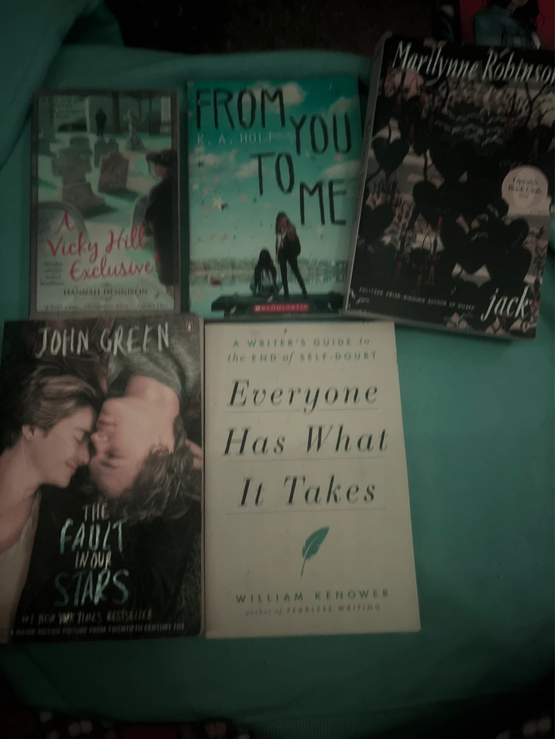 Includes 'The Fault in Our Stars' by John Green, 'From You to Me' by K. A. Holt, 'Everyone Has What It Takes' by William Kenower, 'A Vicky Hill Exclusive' by Hannah Hennibon, and 'Jack' by Marilynne Robinson. These are paperback editions.