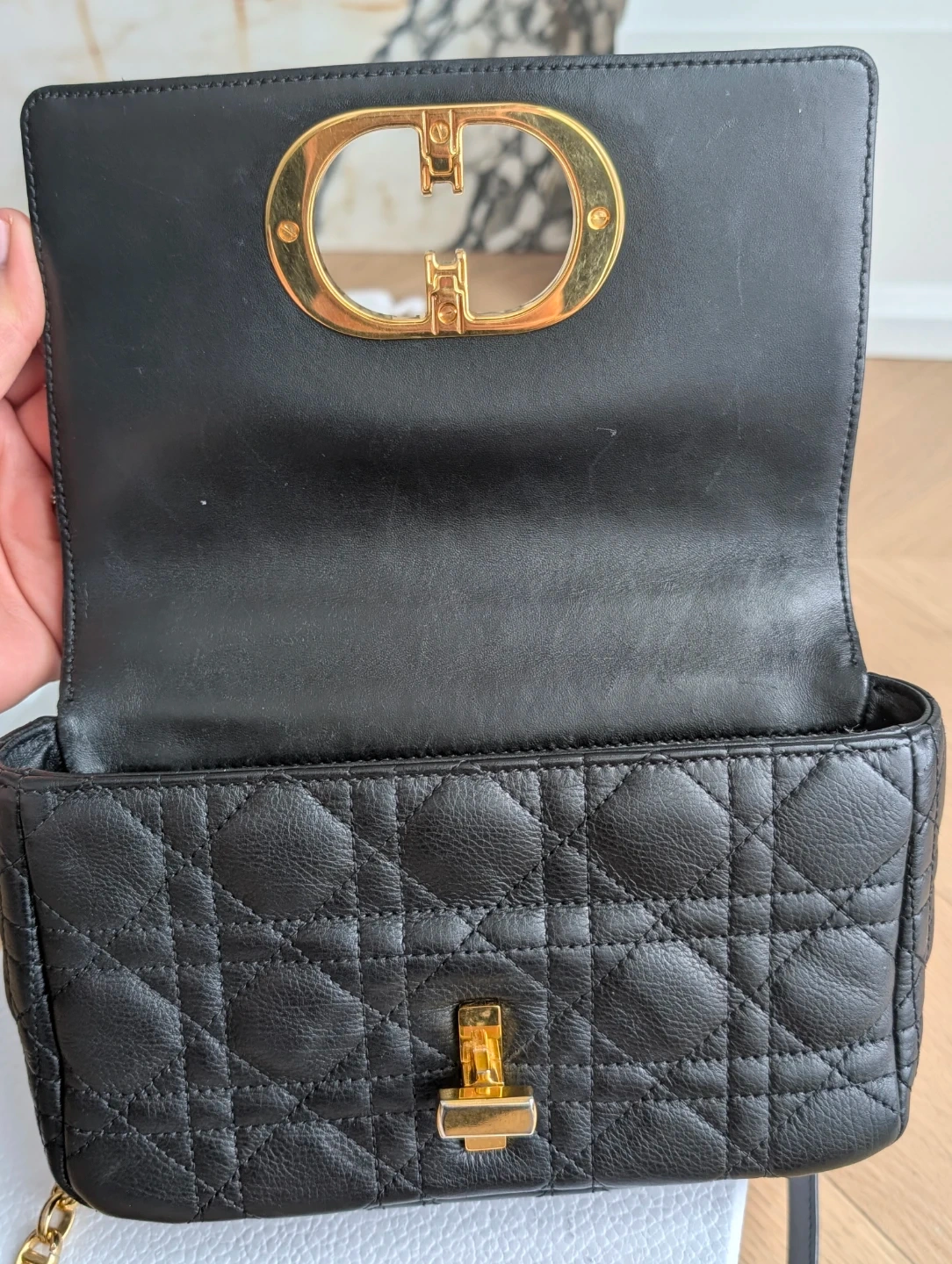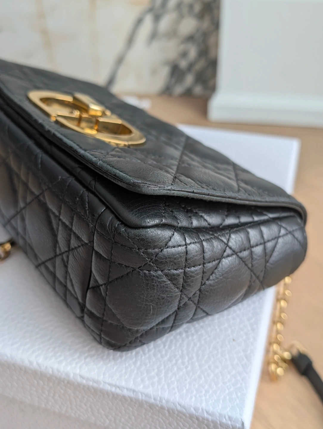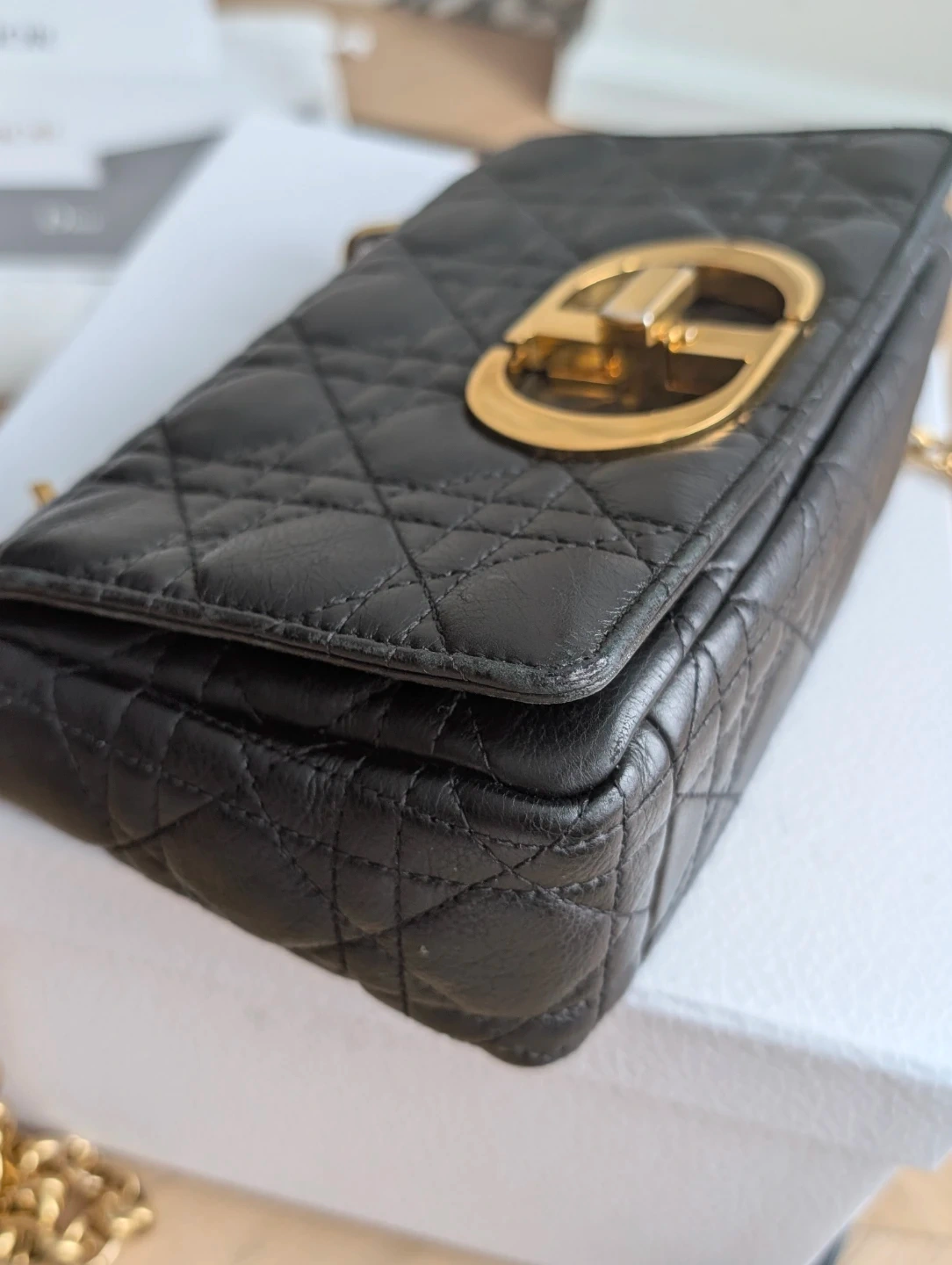 Authentic Small Dior Caro Bag with Black Supple Cannage Calfskin. Has minor scuff only on the edges of the actual flap and inside of the flap. Hardware has some discoloration. The strap is adjustable to get you the perfect length.