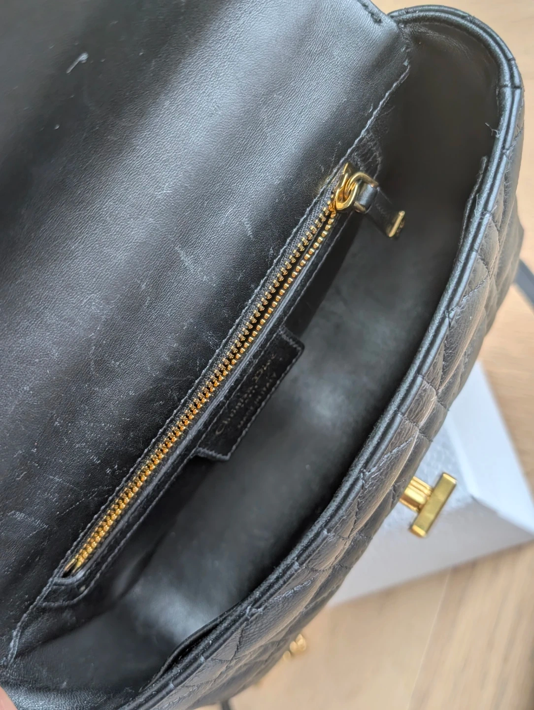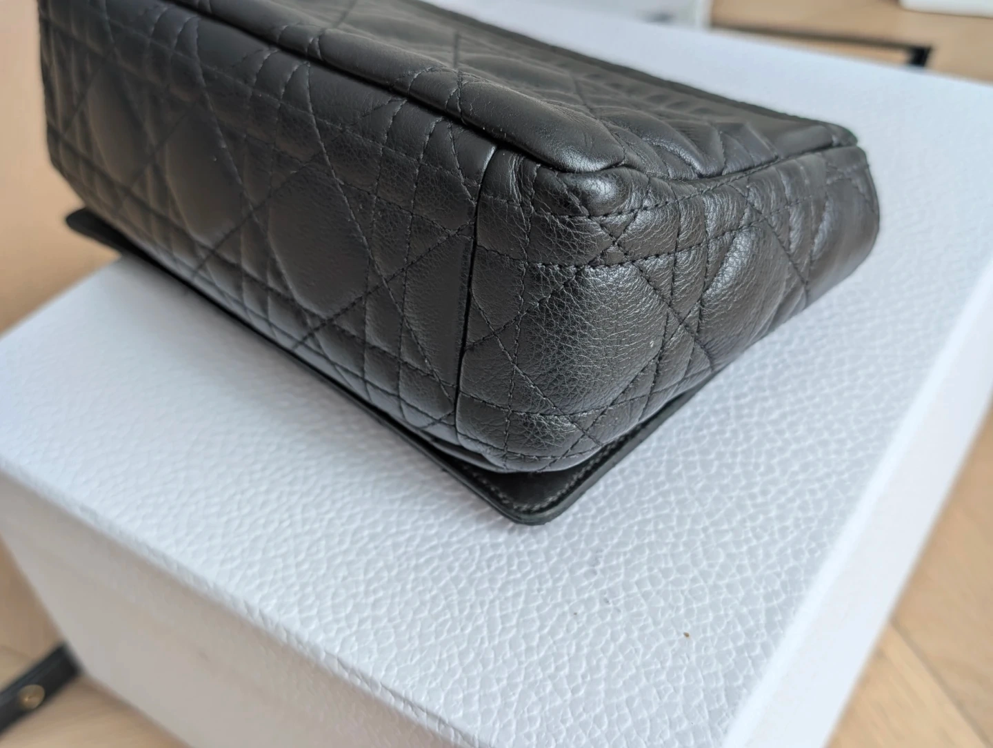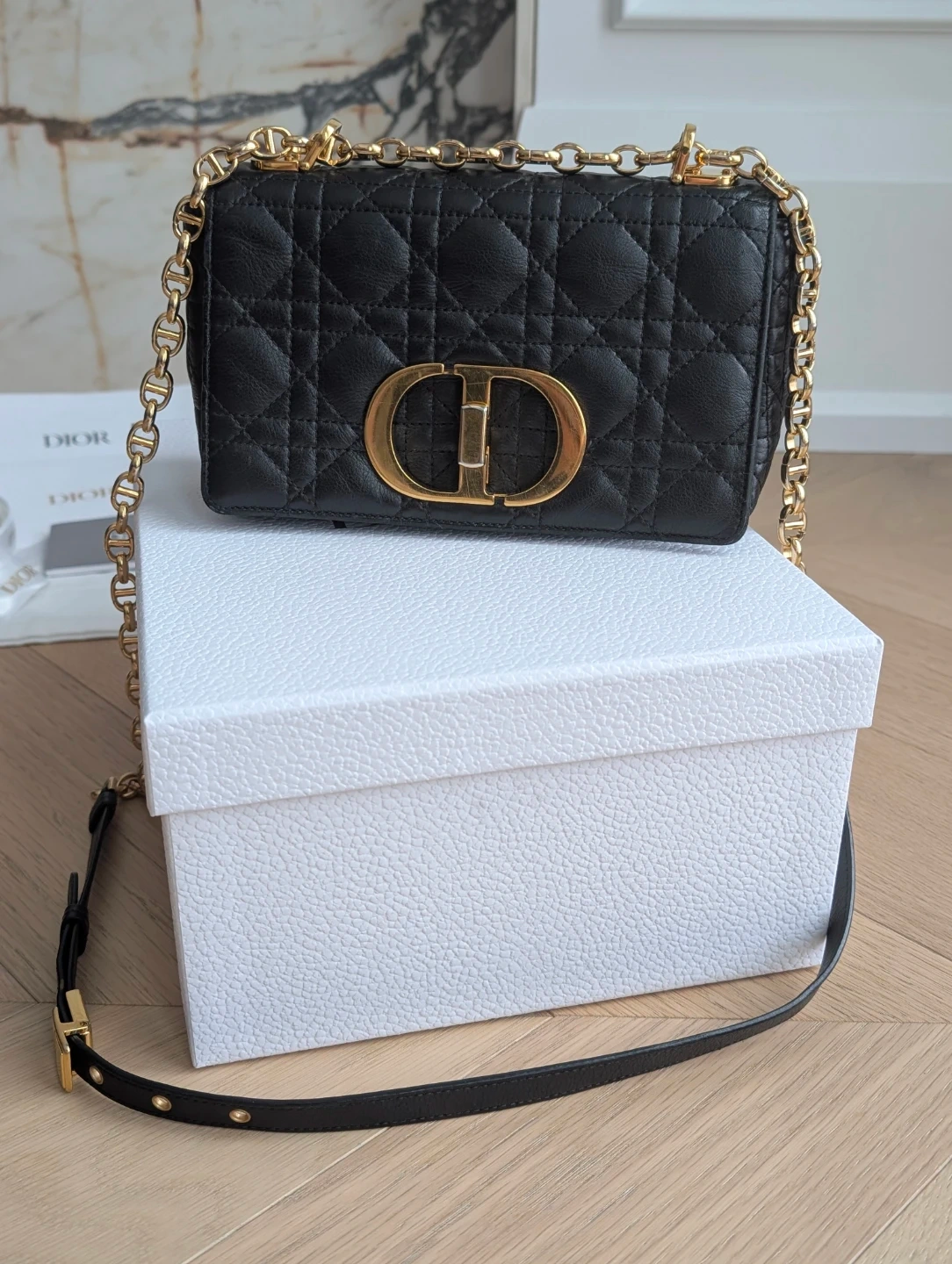 Authentic Small Dior Caro Bag with Black Supple Cannage Calfskin. Has minor scuff only on the edges of the actual flap and inside of the flap. Hardware has some discoloration. The strap is adjustable to get you the perfect length.