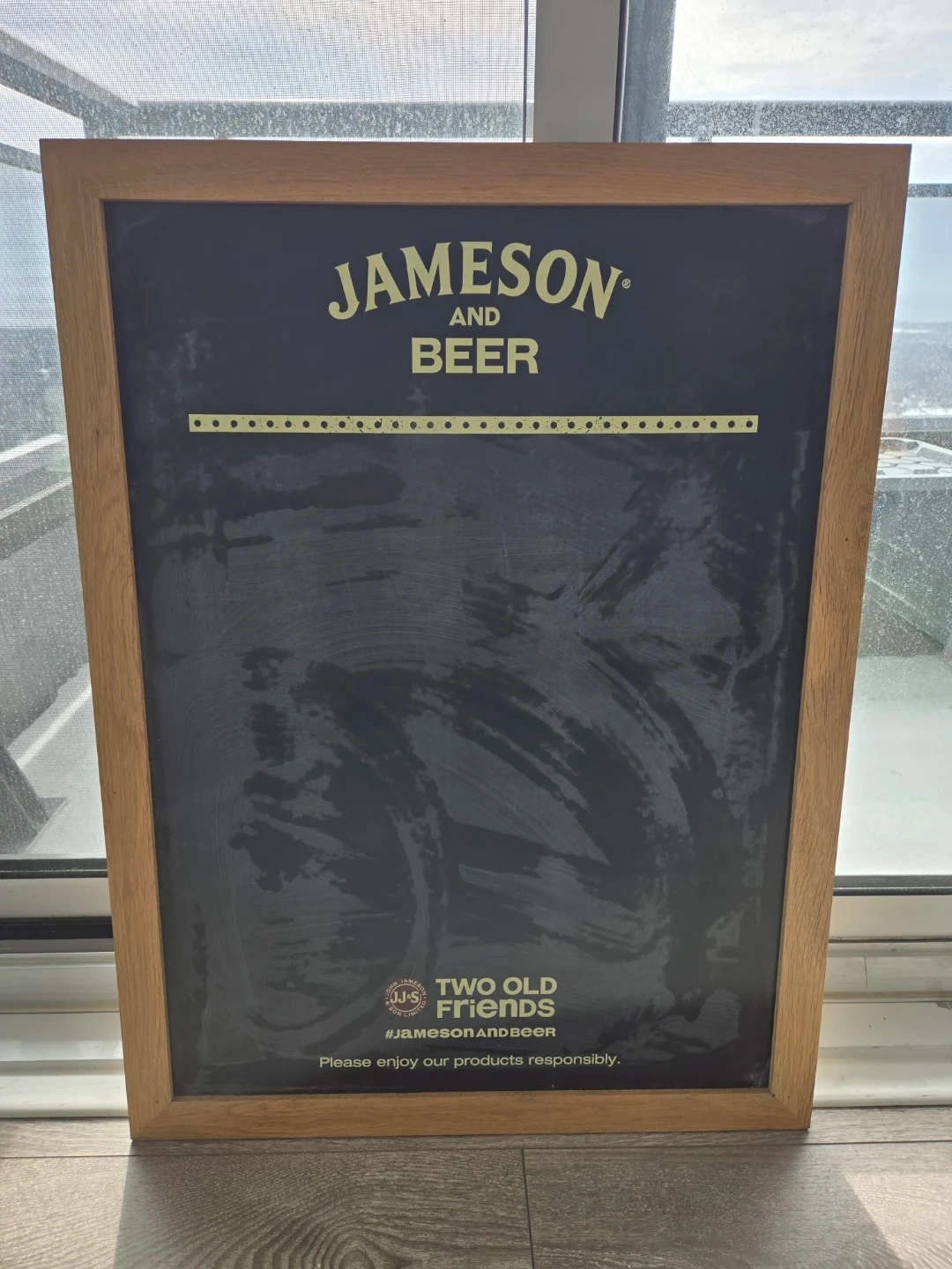 This is a Jameson and Beer branded chalkboard sign, part of the 'Two Old Friends' collection. It features a wooden frame and a black writing surface. Perfect for a home bar or pub setting!