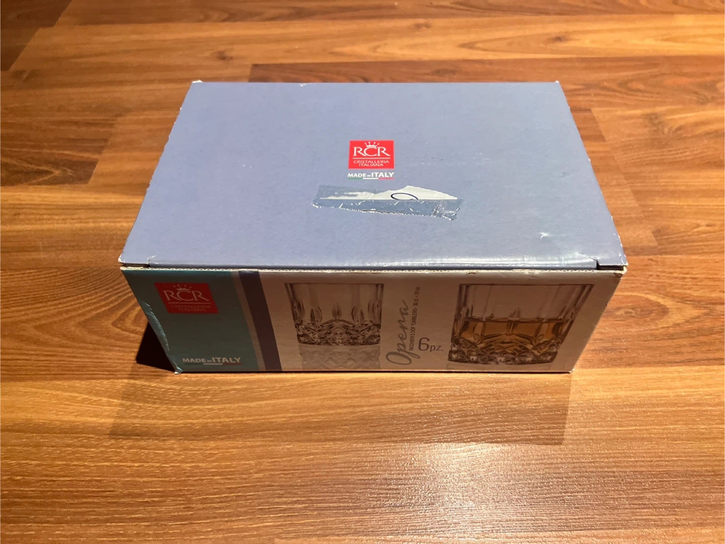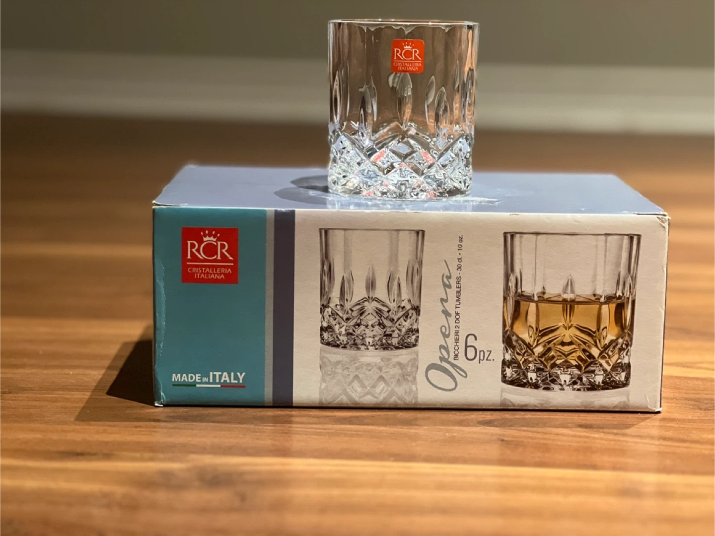 10Selling a set of RCR Cristalleria Italiana Opera tumblers. The box includes 6 glasses, each with a capacity of 10 oz. These are made in Italy and feature a beautiful design. Perfect for your favourite drinks!