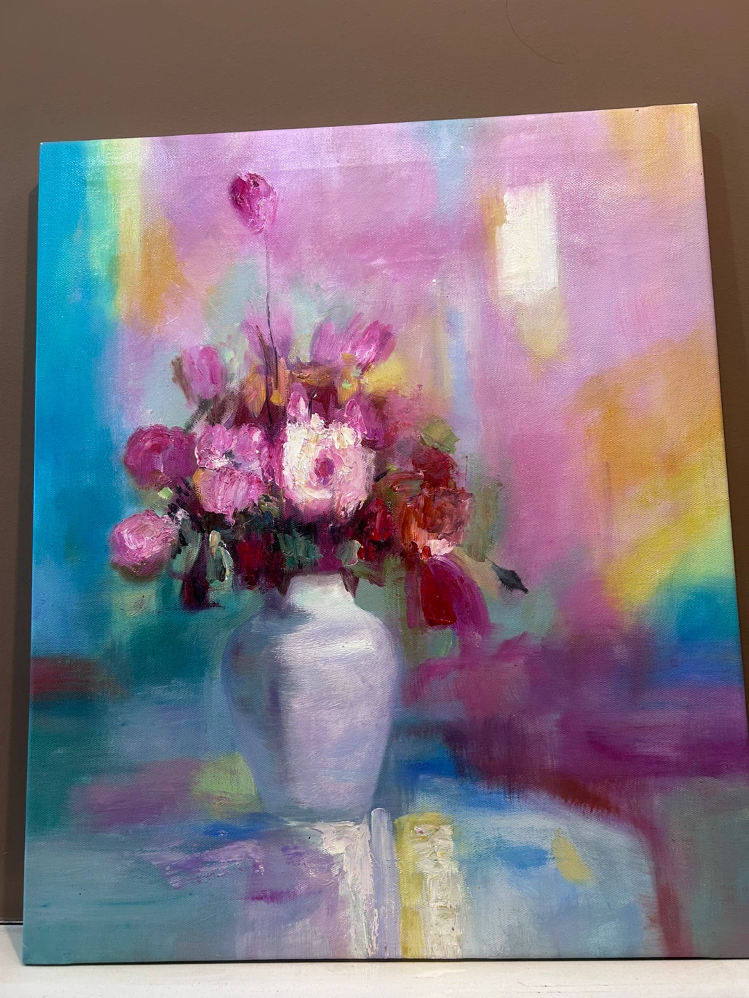 An impressionistic oil painting with back stretch frame only . The vibrant background uses bold strokes of blue, pink, and yellow. This artwork adds a pop of colour to any room.