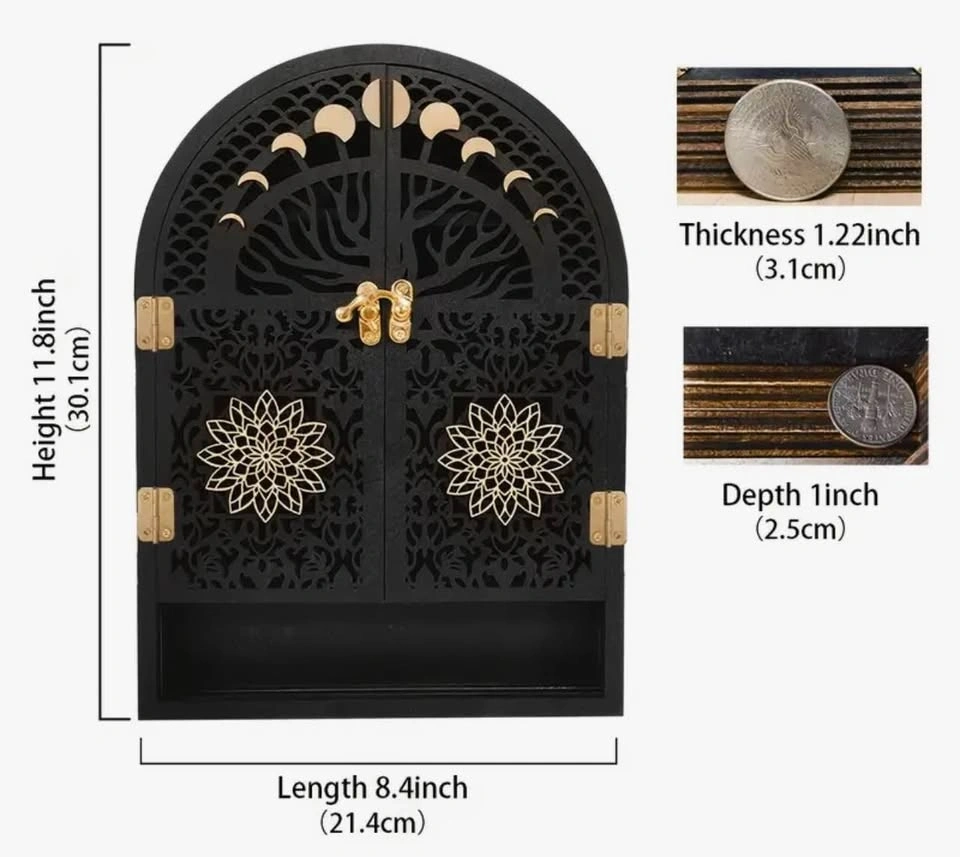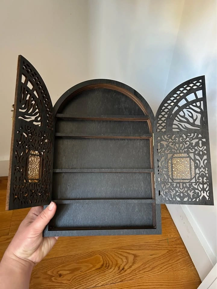 A cute wooden bohemian style display shelf for small crystals or trinkets. Never used it. It's lightweight enough to hang on your wall and has hanging hardware built into the back. But it's also sturdy enough to hold your trinkets. Just pay attention to the dimensions in the last pic as it's fairly small. Pickup in Bushwick near the JMZ Myrtle Broadway stop.