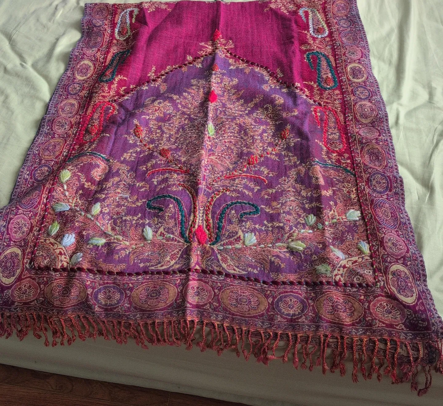 This beautiful shawl features intricate paisley patterns with colourful embroidery and fringe tassels. It's made of a soft woven material. This piece adds a touch of elegance to any outfit.
