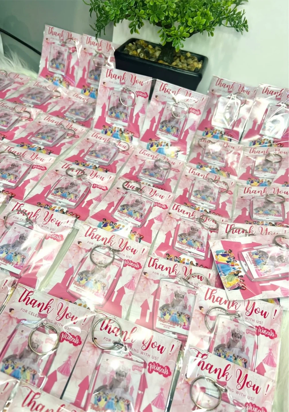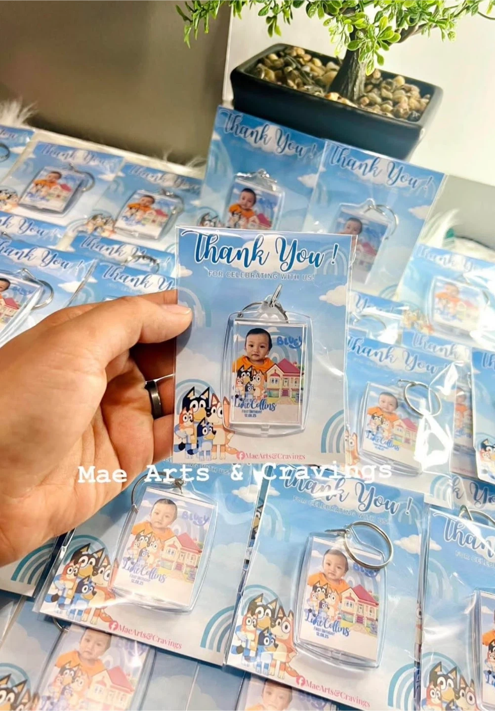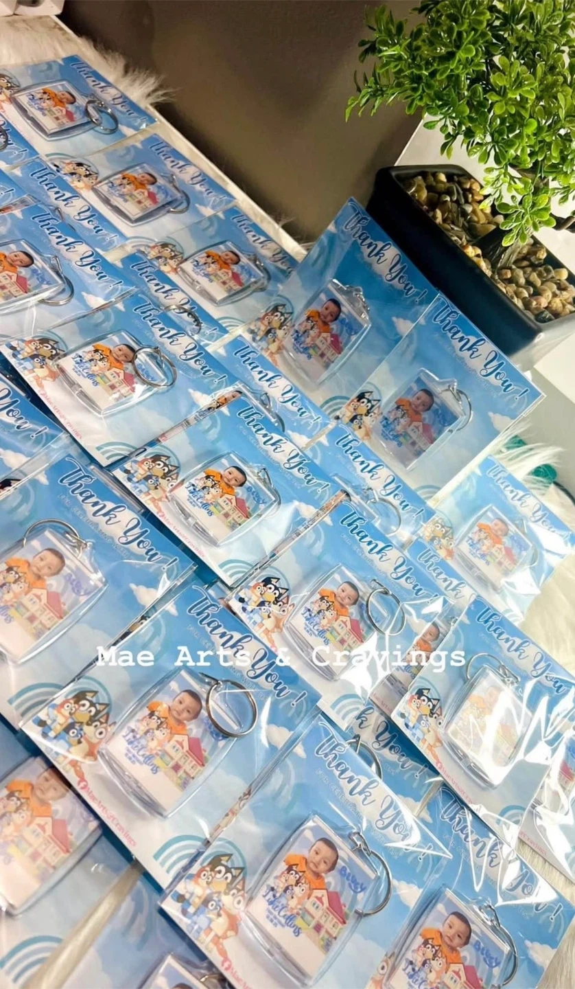 Personalized keychains perfect for thank you gifts at celebrations. Each keychain can be customized with a photo and name, making them a unique memento. They're great party favours for birthdays or any special event!