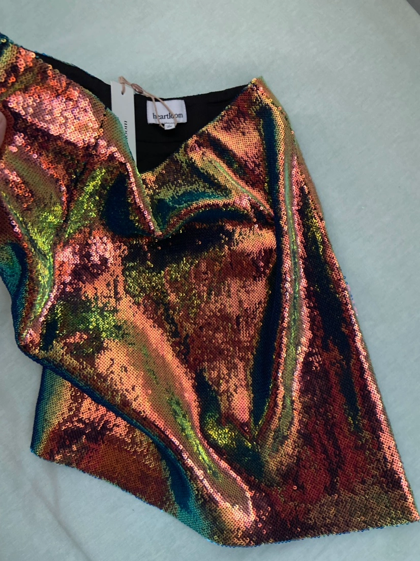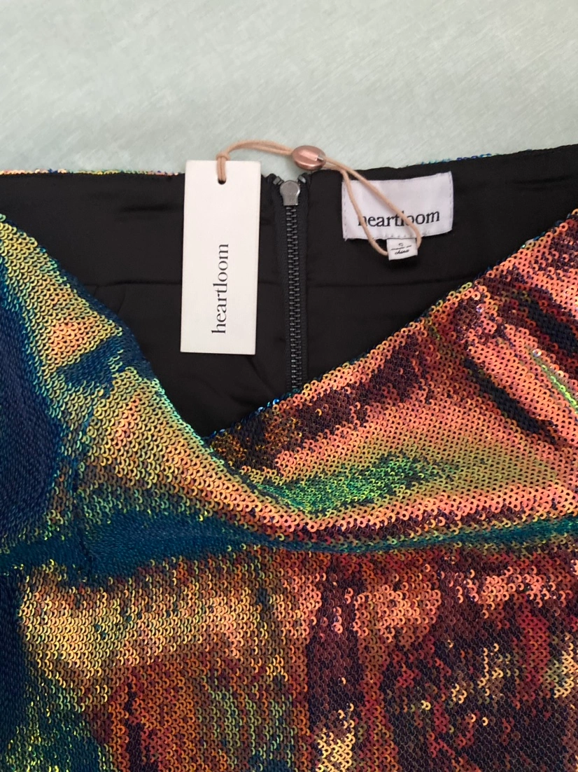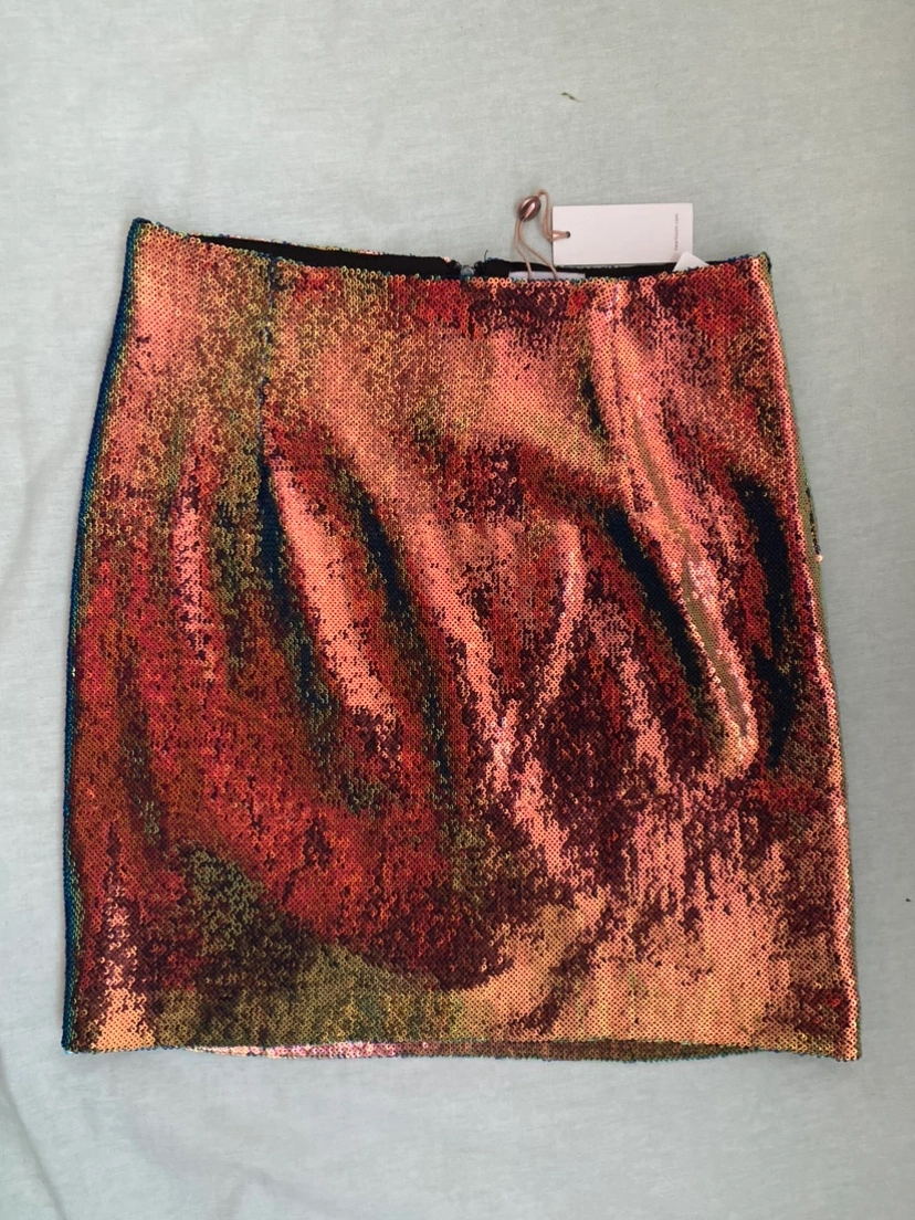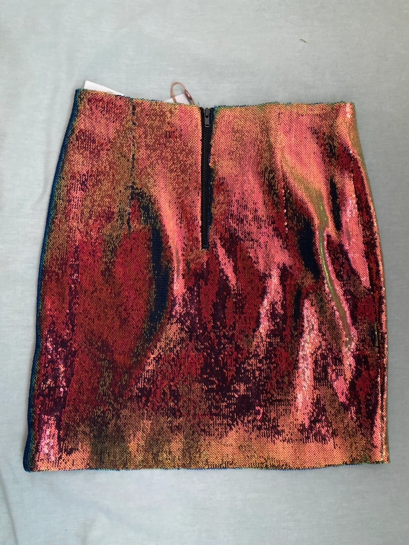 Size small skirt. Beautiful iridescent green, blue, and pink sequins. Features zipper on the back.