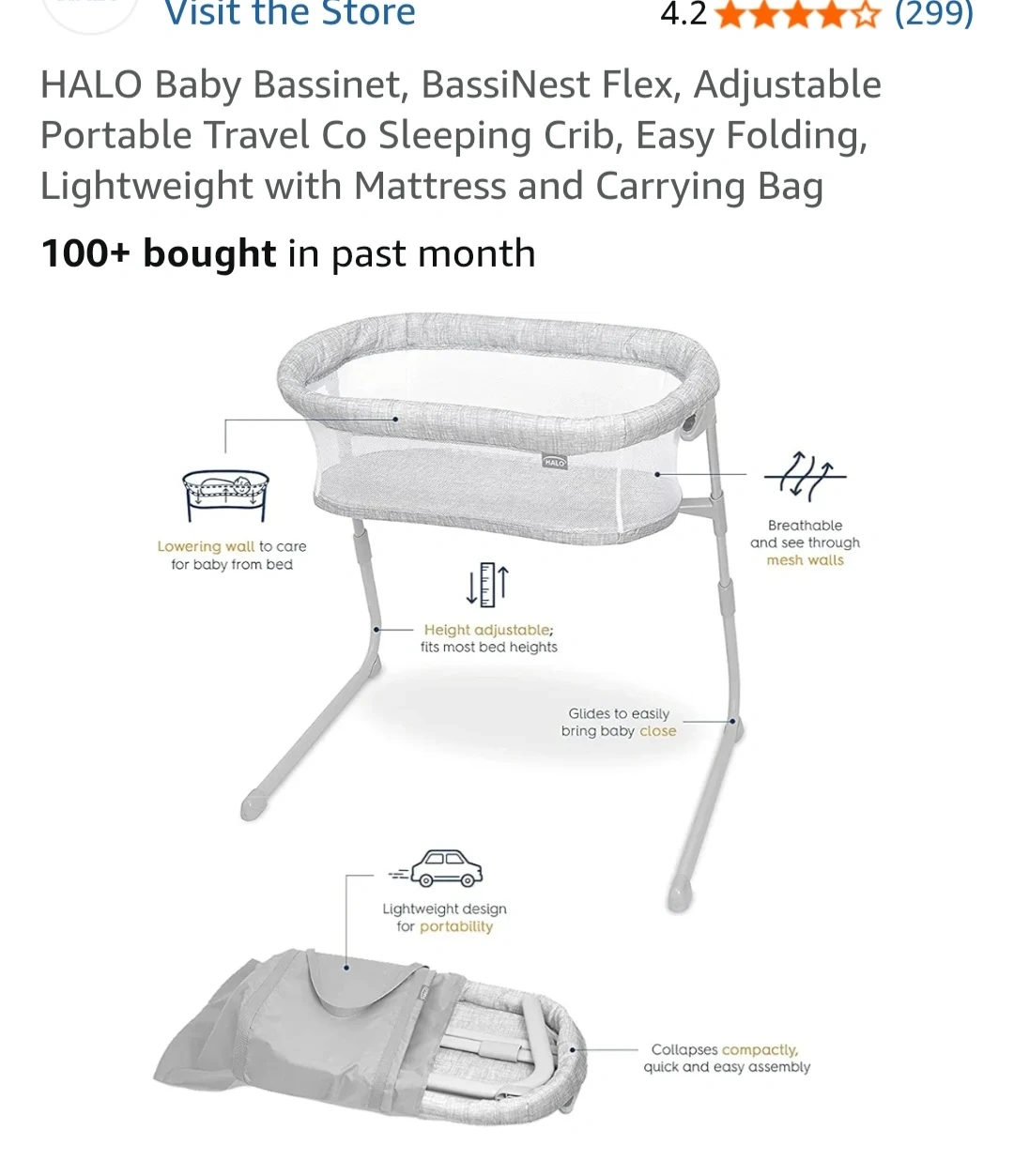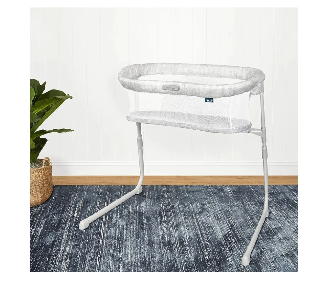 This HALO Baby Bassinet Flex is a portable, adjustable co-sleeping crib. It features mesh walls for breathability and glides to come close to your bed. Includes mattress and carrying bag. Height adjustable to fit most bed heights.