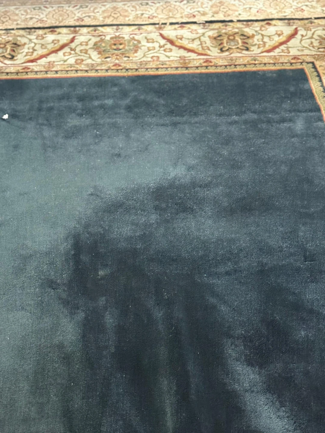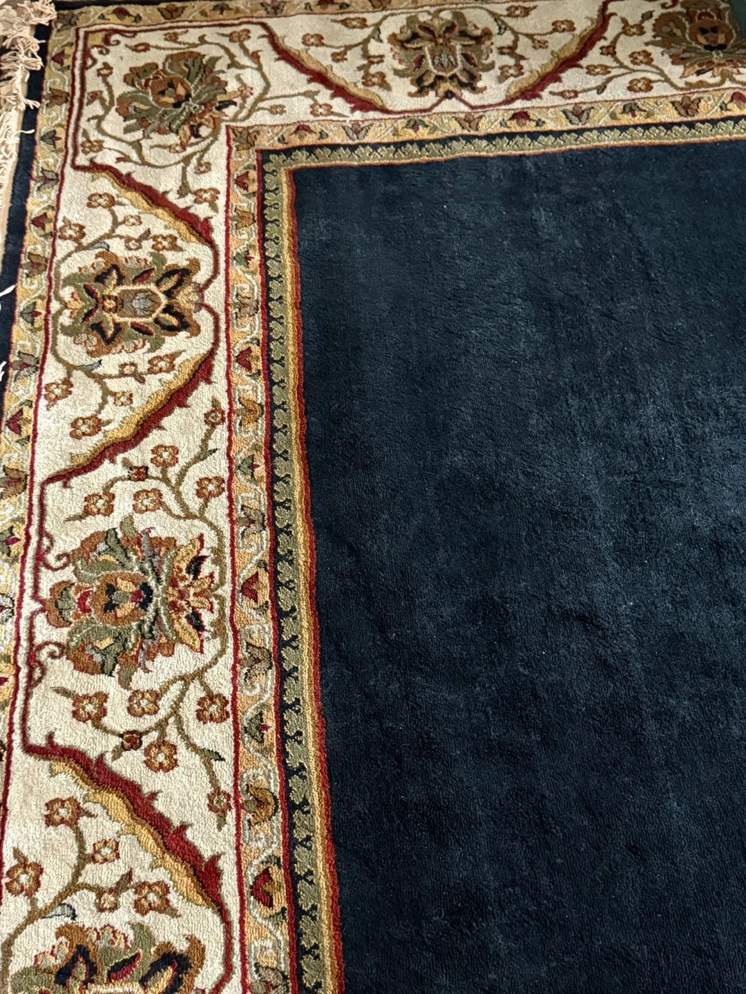 A dark blue area rug featuring a traditional, multi-coloured border. It's a beautiful statement piece for any room! Material is soft and durable.