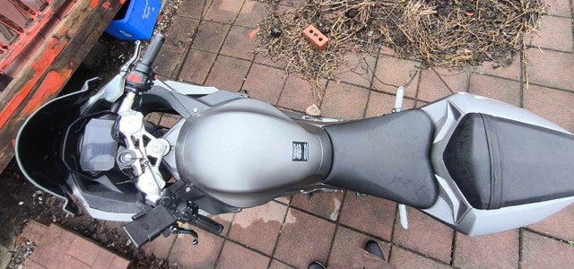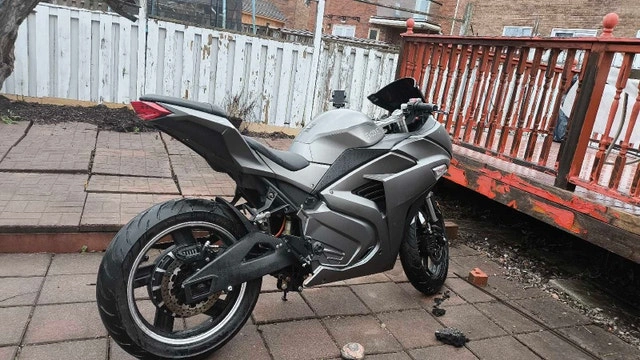 Grey electric motorcycle with 84v 60ah long lasting battery.
