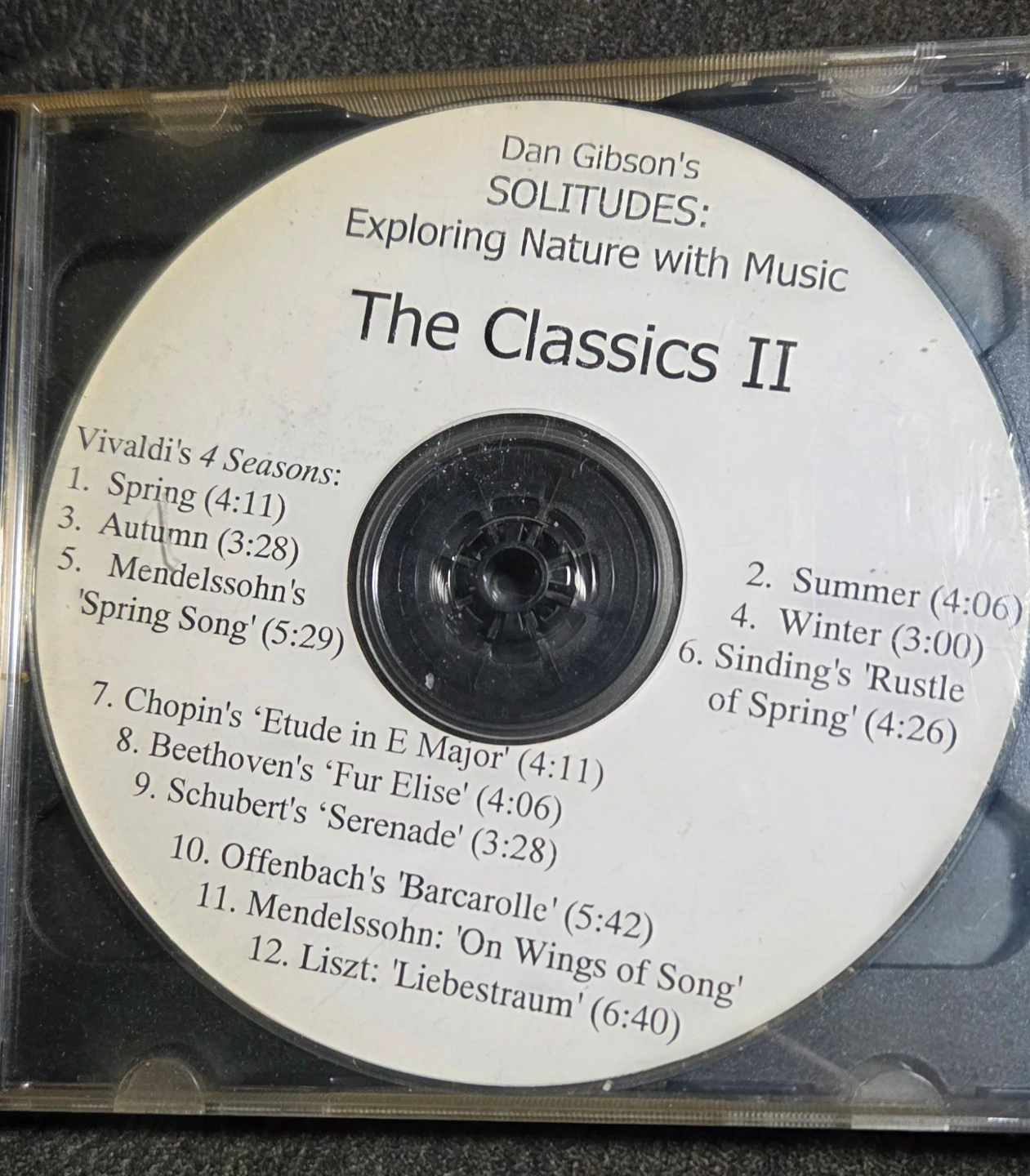 Collection of three Dan Gibson's SOLITUDES CDs: Great Lakes Suite, The Classics II, and Appalachian Mountain Suite. Each CD features music blended with nature sounds for a unique listening experience.