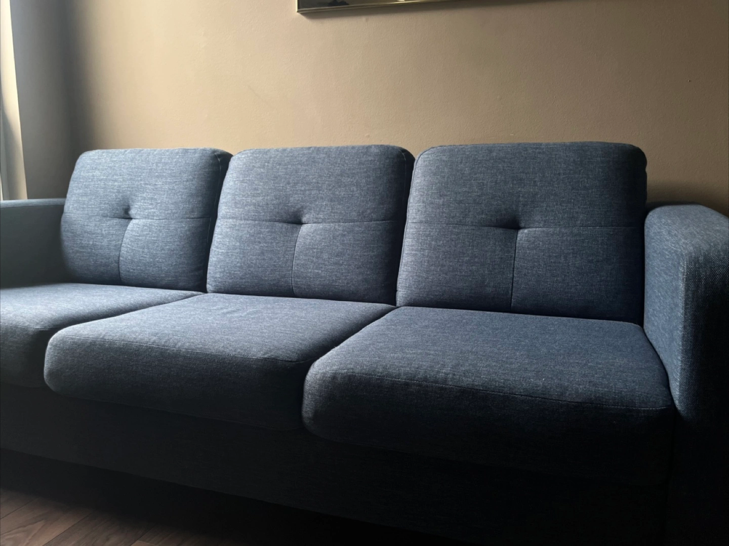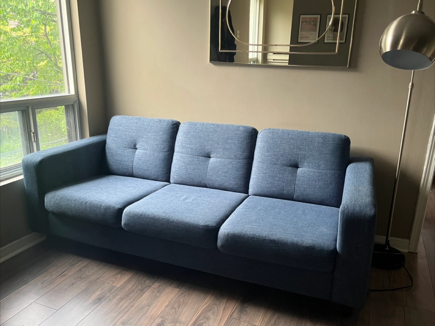 I was very happy with this couch. It’s medium-firm and SUPER comfortable. I’m just changing up my colour scheme in my new place, so blue no longer works for me.