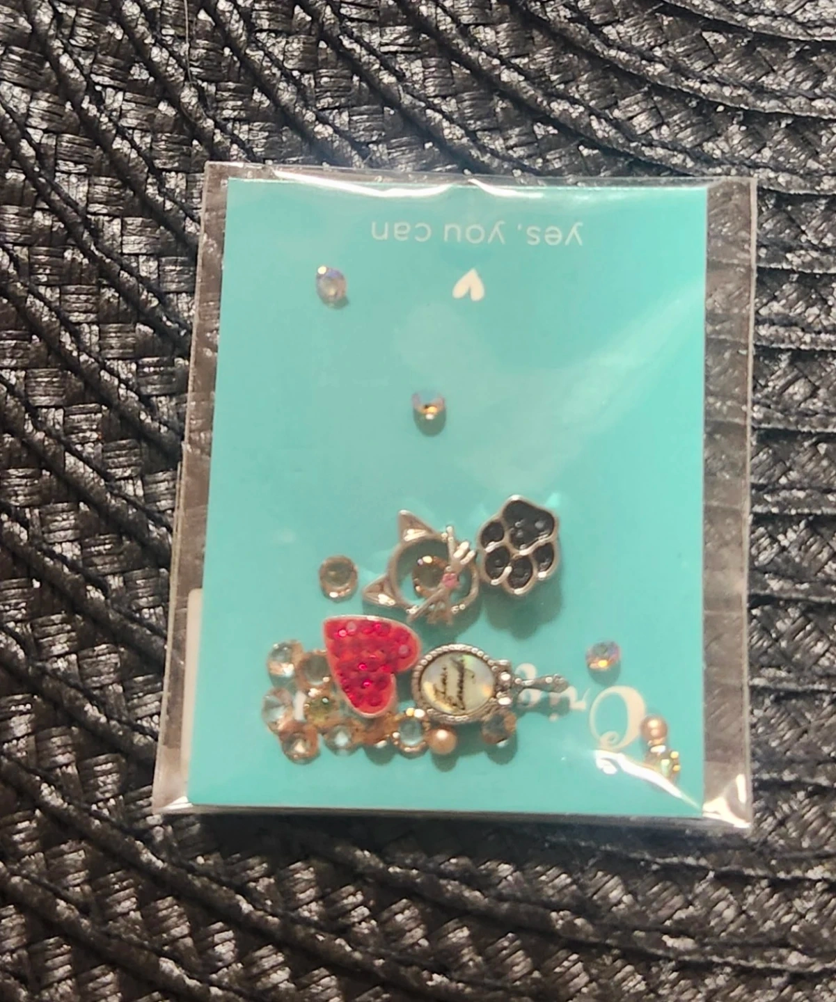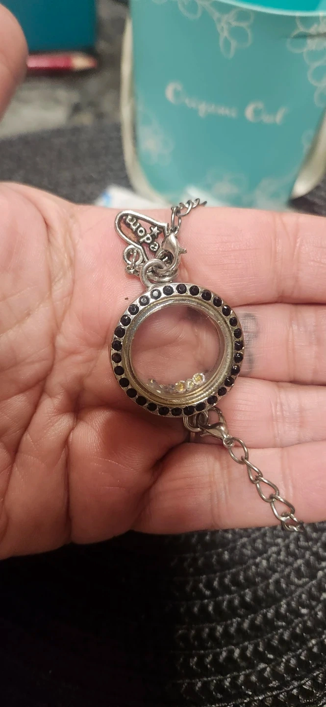 The Locket: It features a bezel set with black Swarovski crystals. This is a "twist" style locket, meaning the face unscrews so you can easily swap out the charms inside.