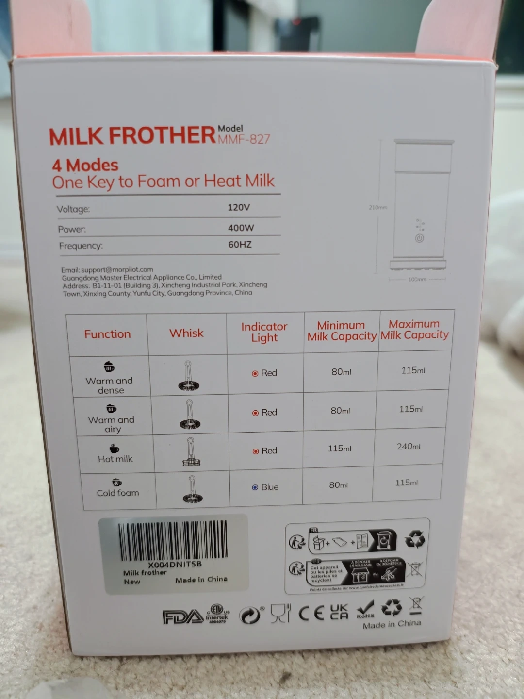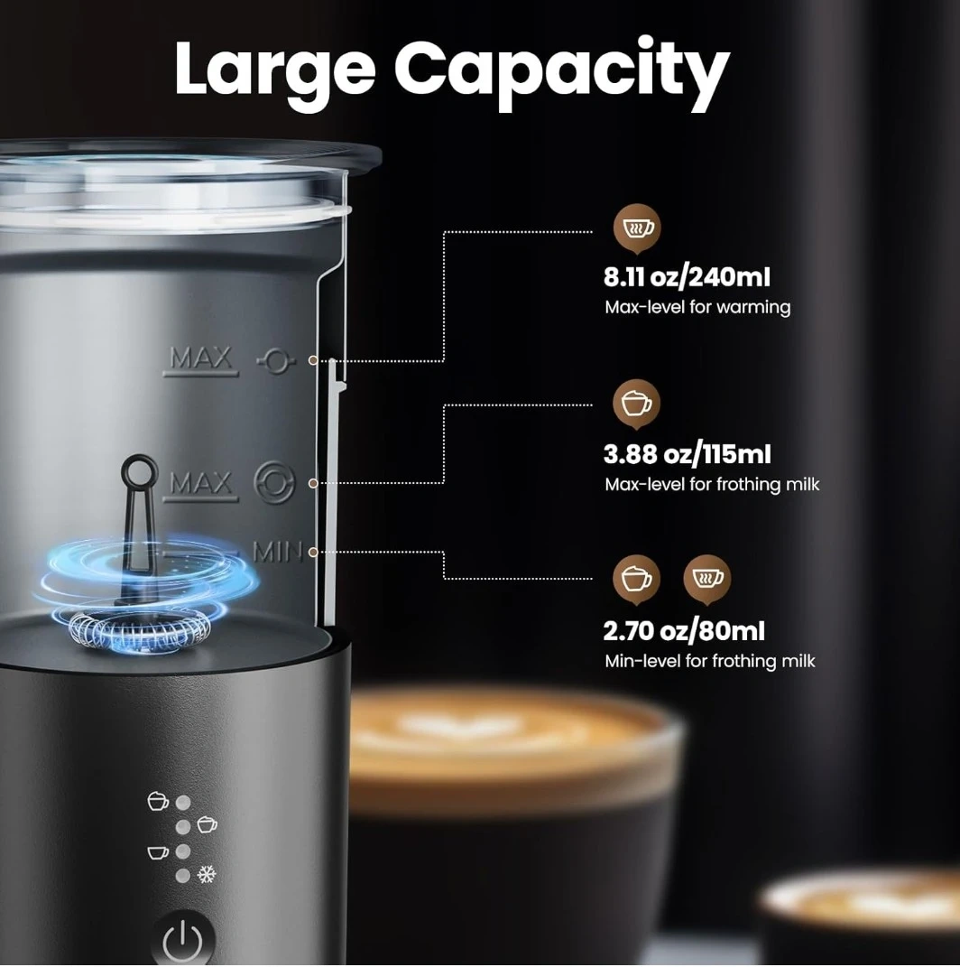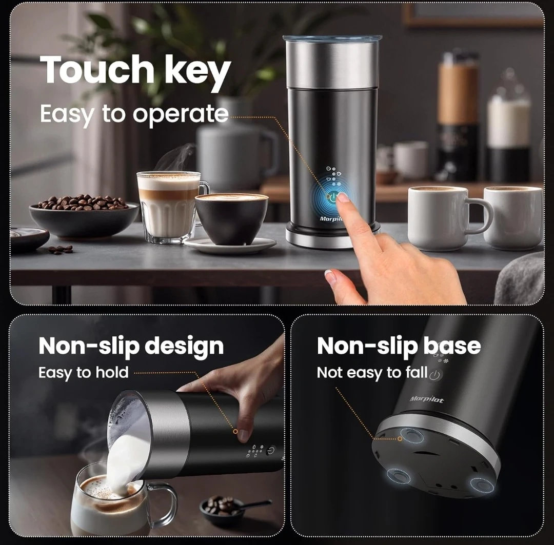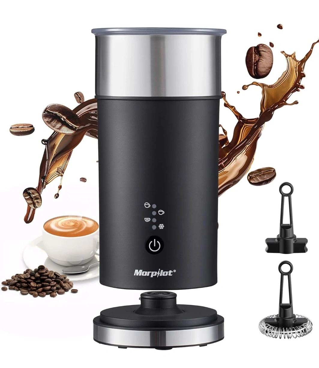 This Morpilot milk frother can foam or heat milk. It has 4 modes: warm and dense, warm and airy, hot milk, and cold foam. It comes with a whisk attachment and has indicator lights.