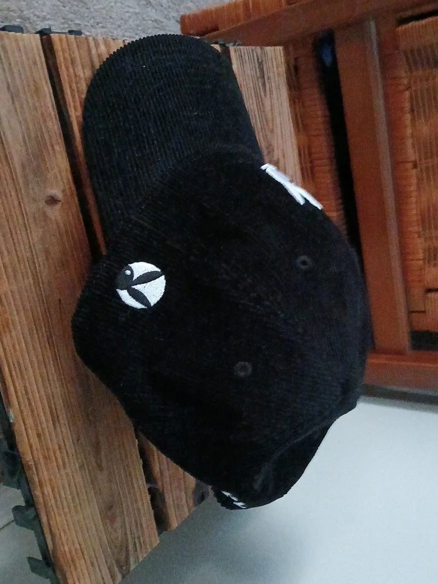 Black corduroy baseball cap with the iconic Playboy bunny logo embroidered on the front. It features a classic adjustable strap for a comfortable fit. Made with 100% cotton.
