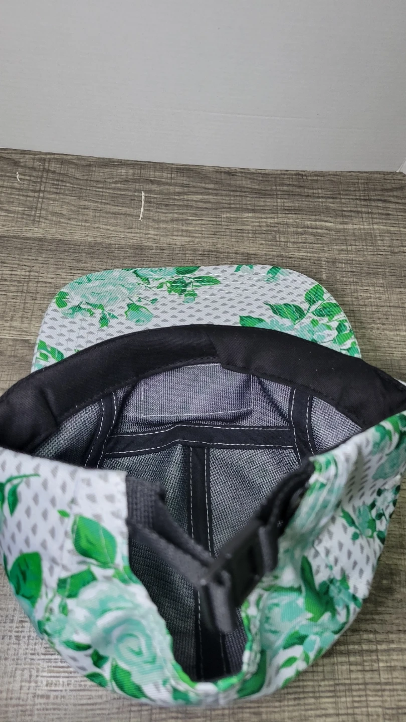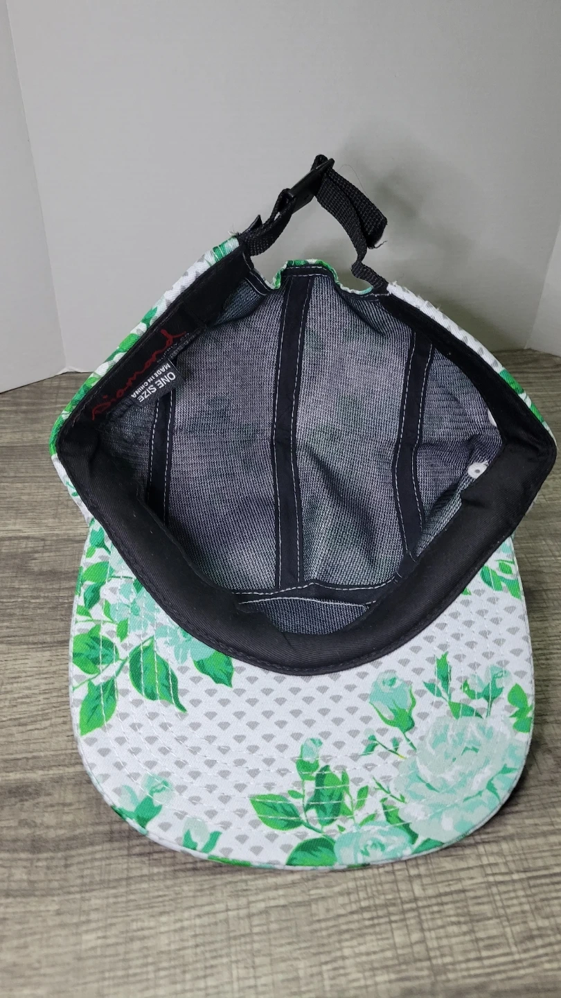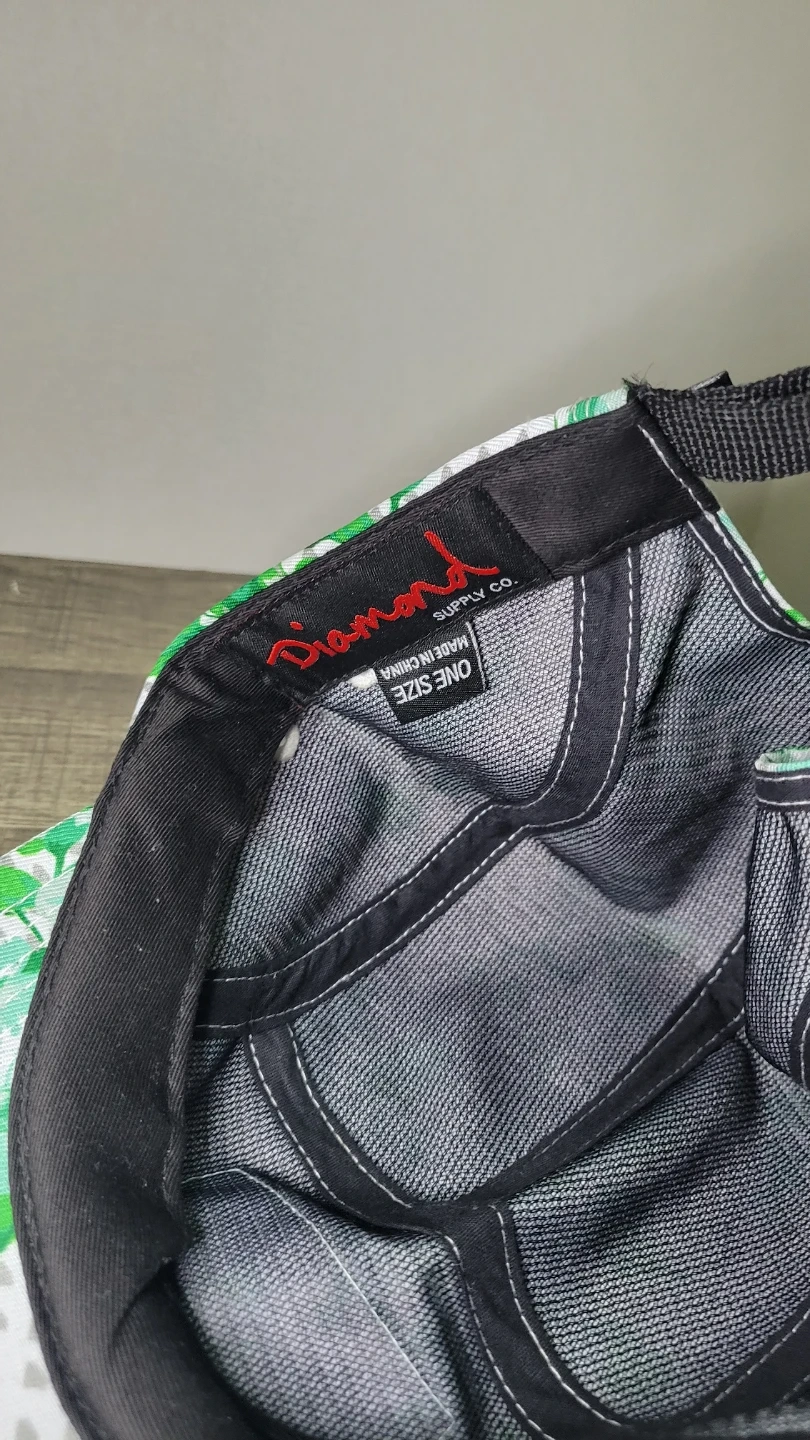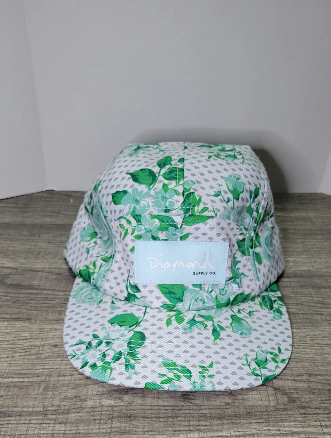 Diamond Supply Co. 5-panel hat with a white and green floral pattern. One size fits most with an adjustable strap. This hat's design offers a fresh look!