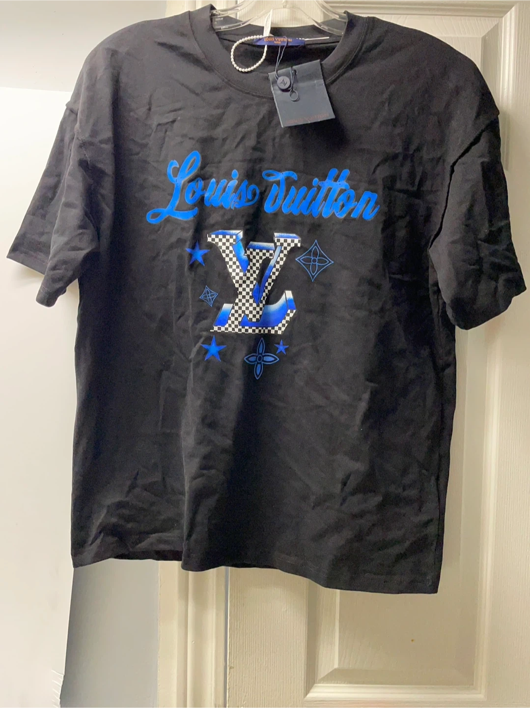 This is a Louis Vuitton t-shirt with a black base and blue accents. It features the Louis Vuitton script logo and a checkerboard LV monogram. Cotton material.