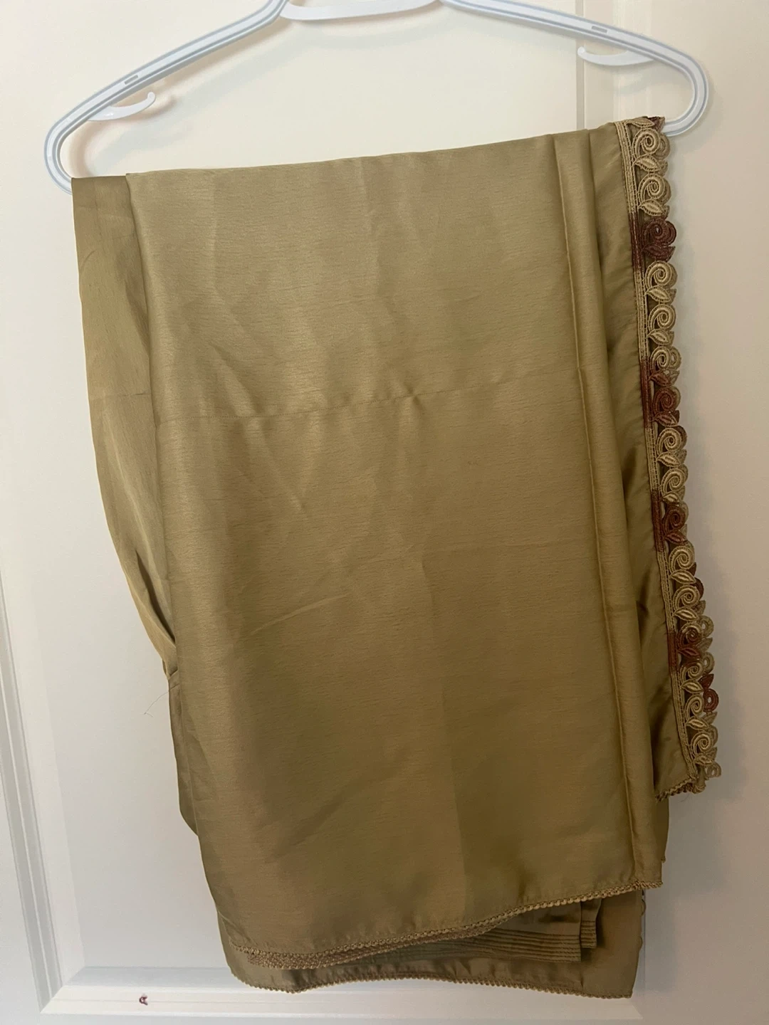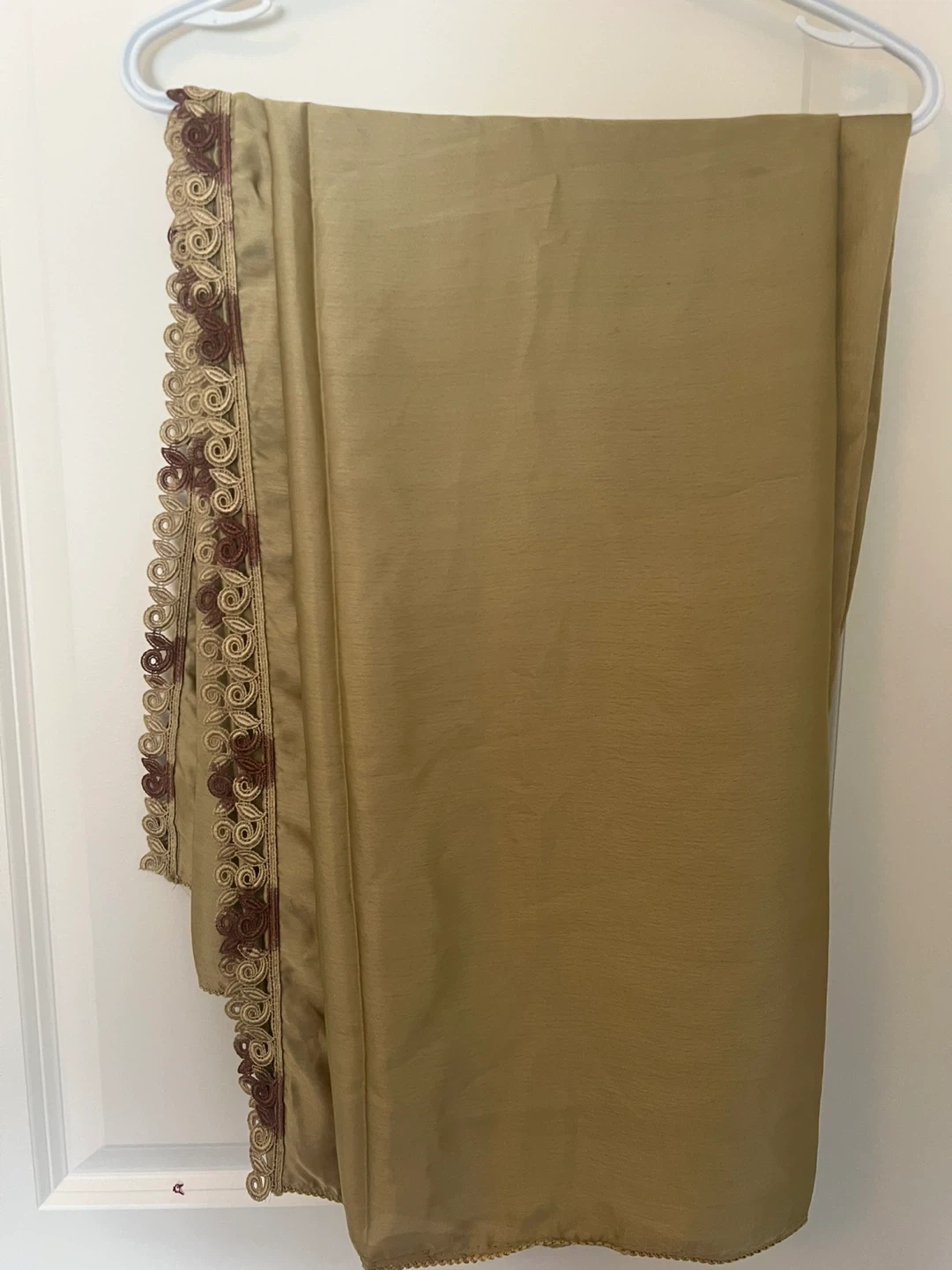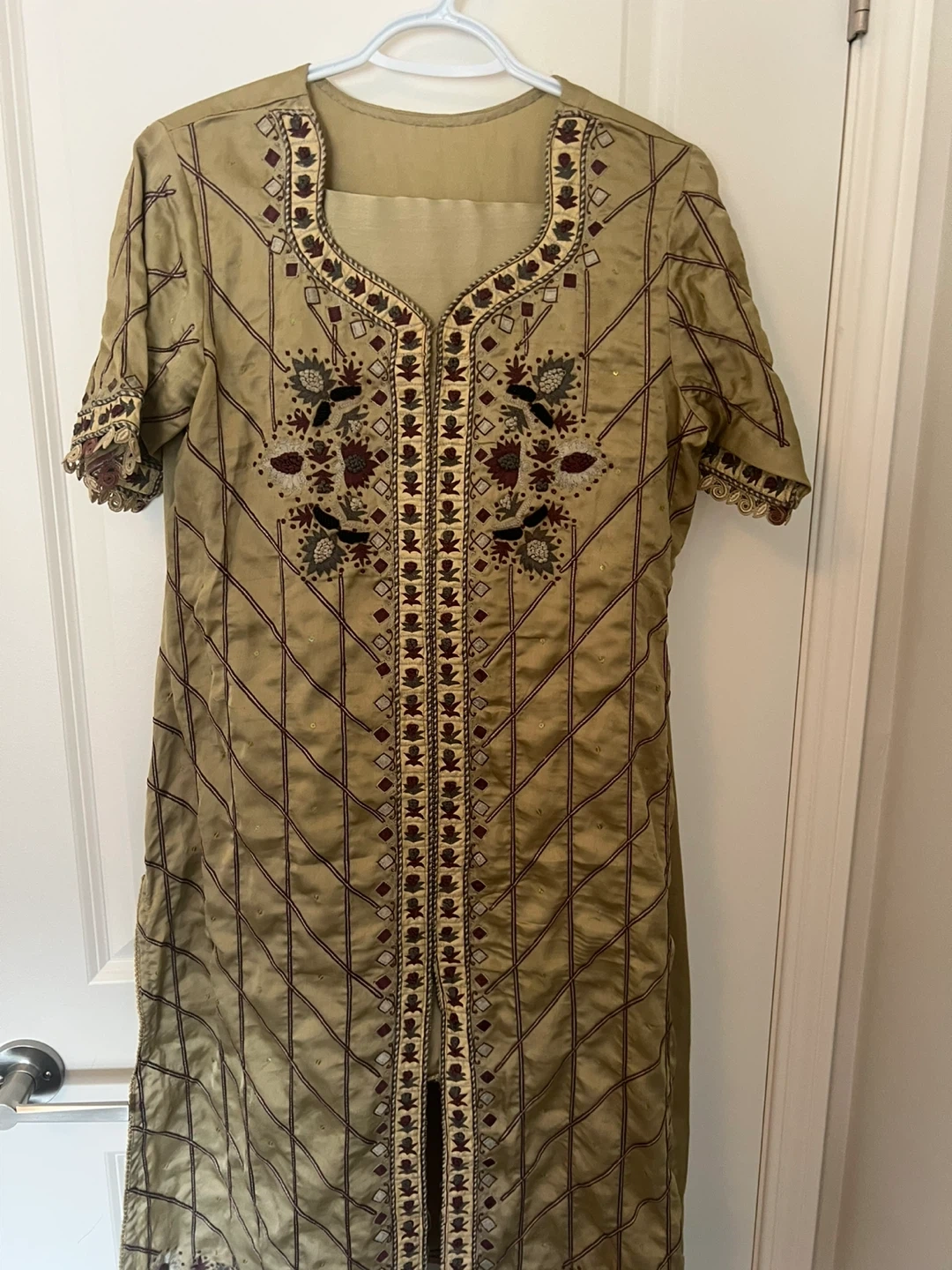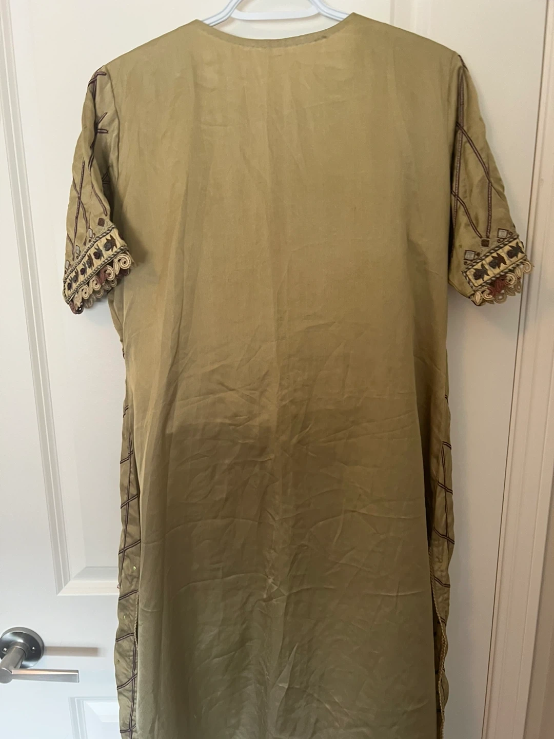 A beautiful olive green kurta and matching pants set. It features intricate embroidery along the neckline and sleeves, with a decorative trim on the pant cuffs. This outfit is perfect for festive occasions or cultural events.
