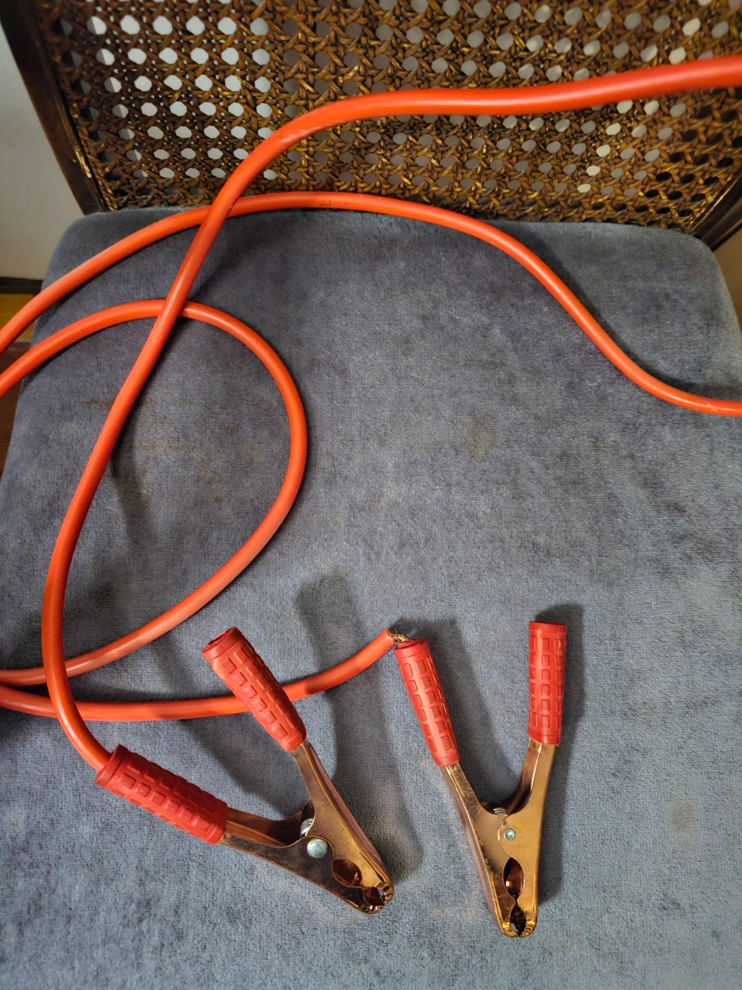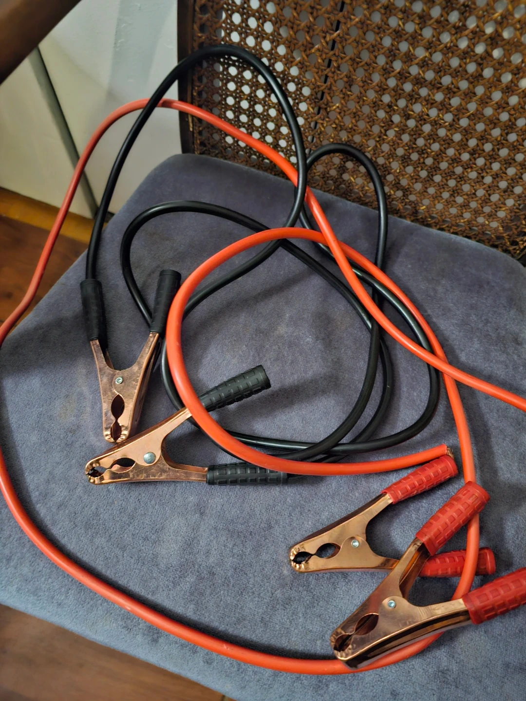 These are two sets of jumper cables, one black and one red. Each set features sturdy copper clamps for a reliable connection. They're handy to have in case of a dead battery!