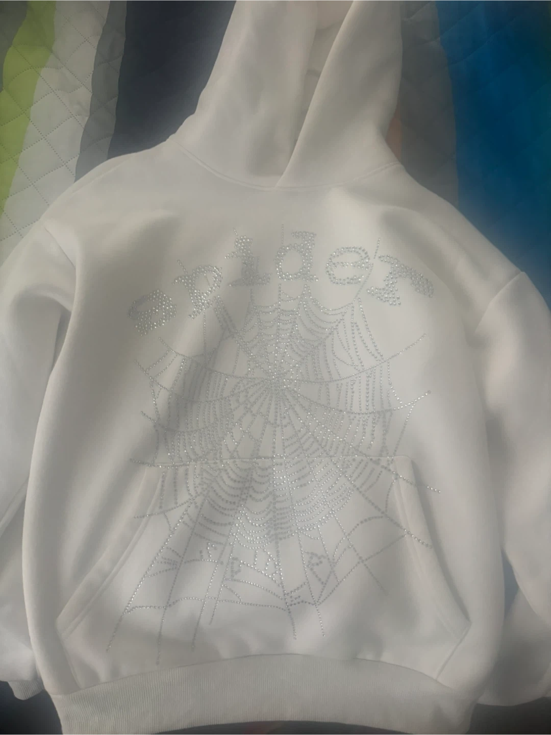 White hoodie with rhinestone spider web design. It's a comfy pullover style. Suitable for cool weather.