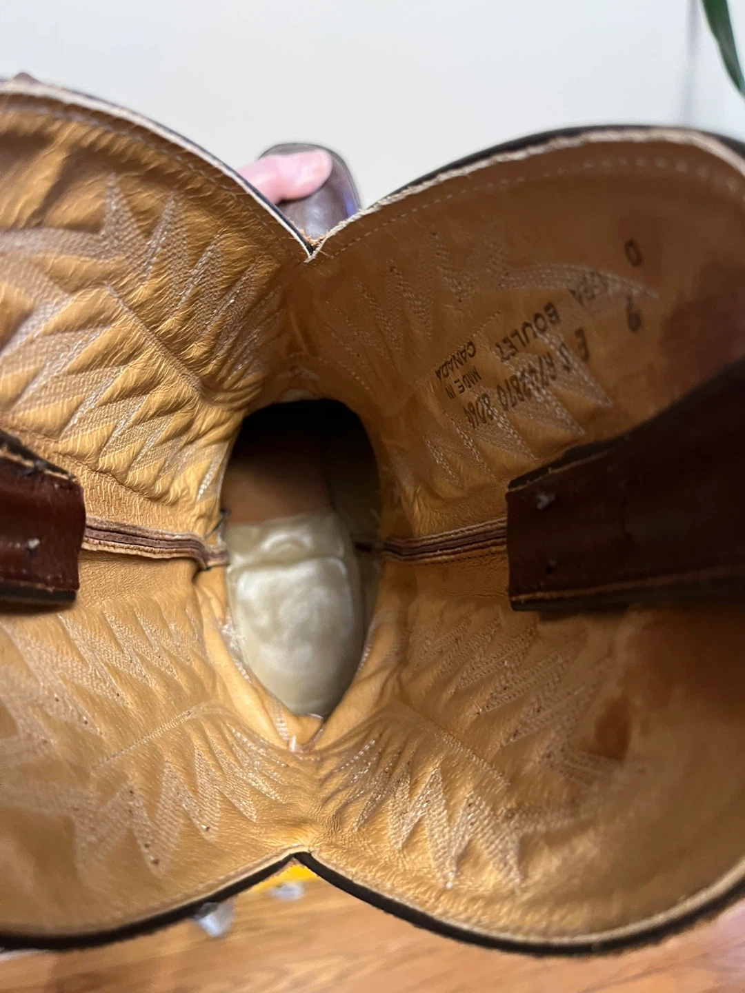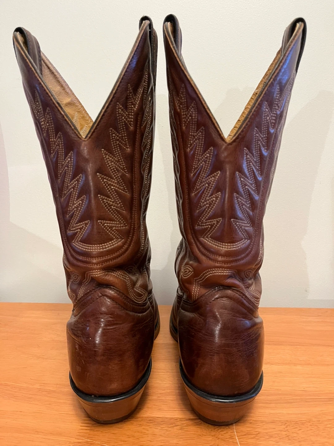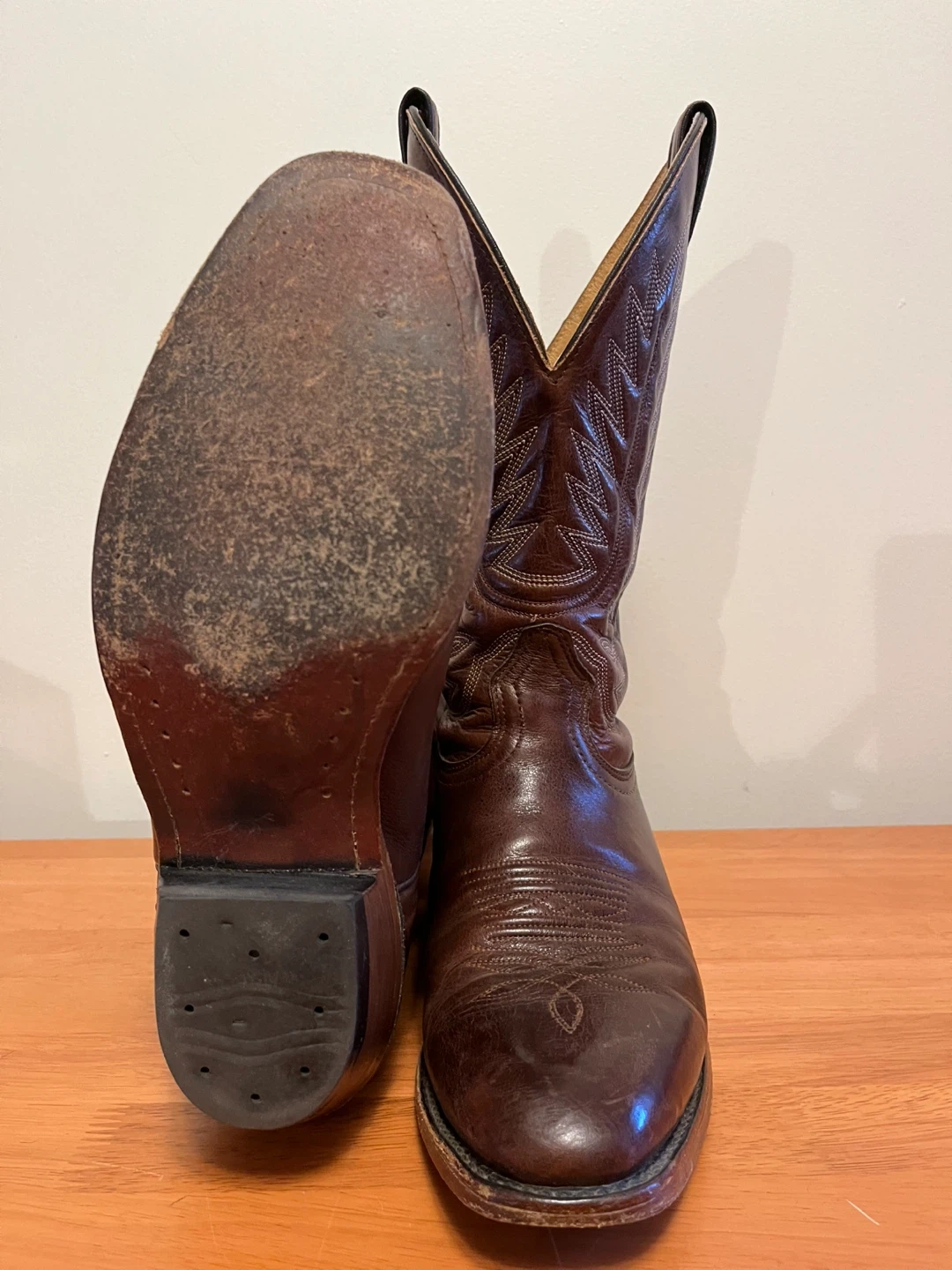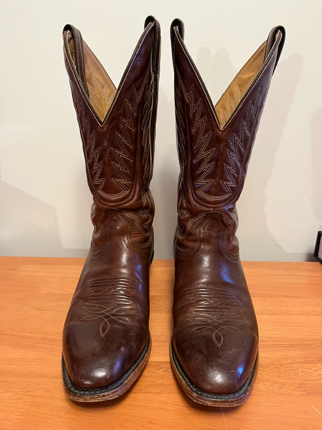 Boulet brown leather cowboy boots. Features decorative stitching on the shaft and vamp. Leather construction, full leather lining and footbed.