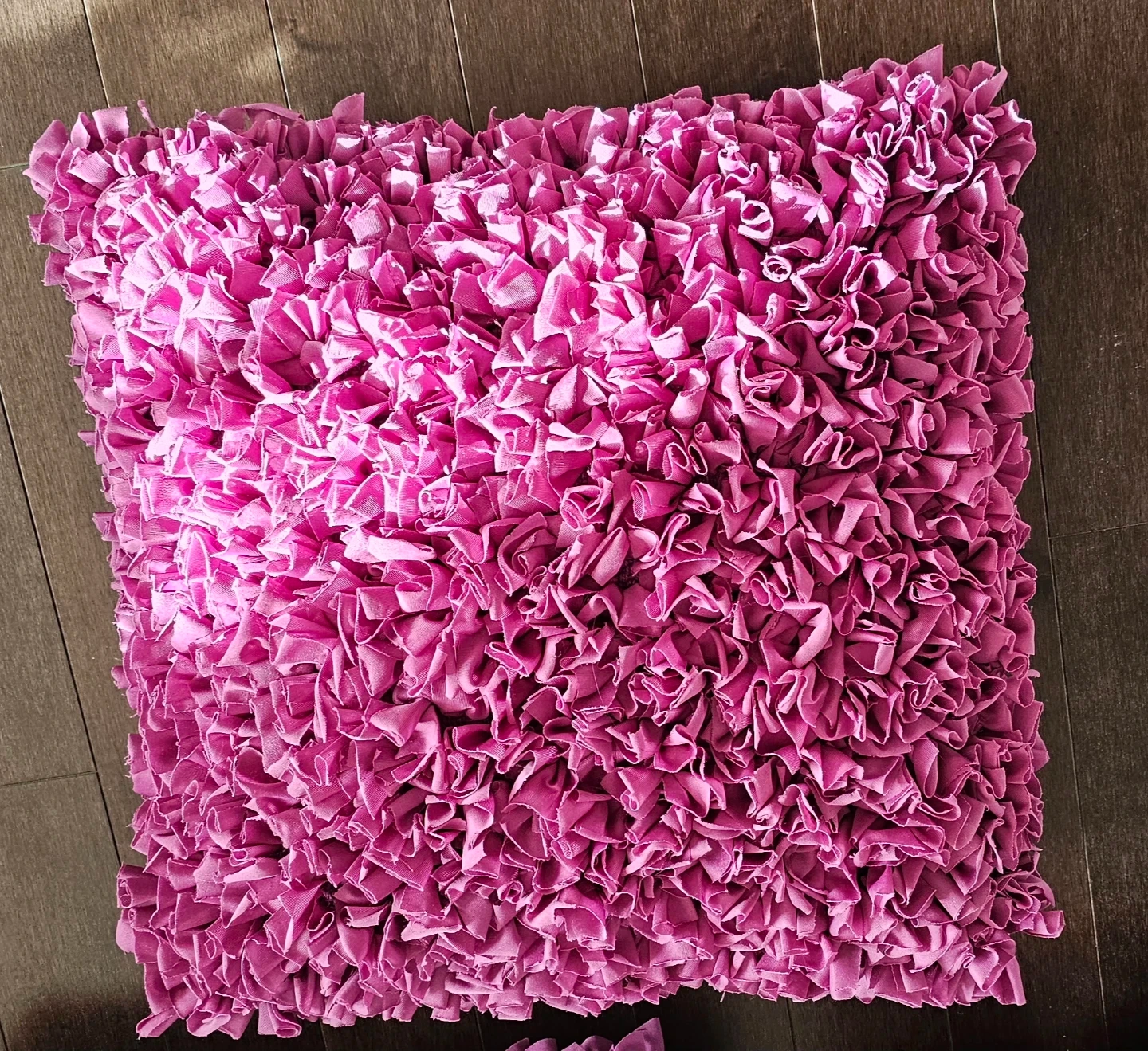 Four square throw pillows in a vibrant purple colour. They feature a textured, shaggy fabric design. Great for adding a pop of colour to any room!