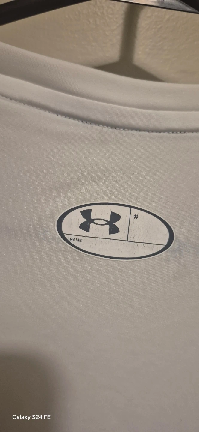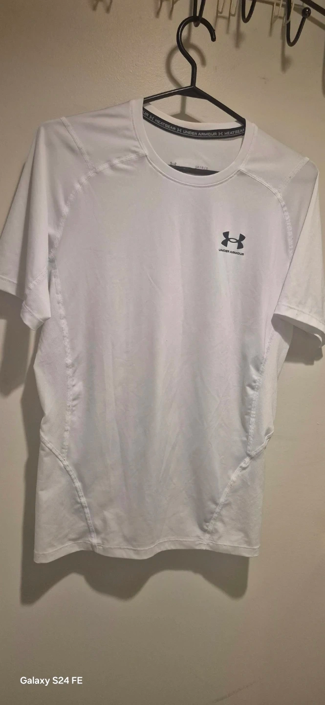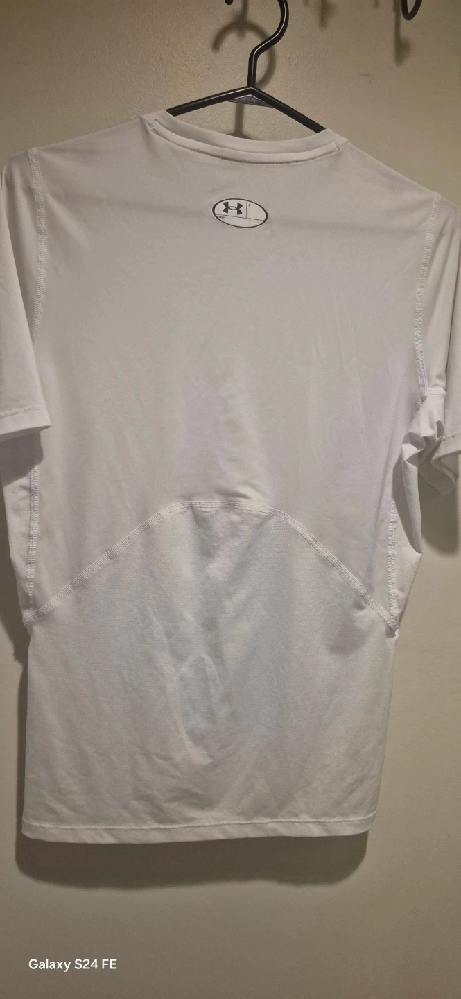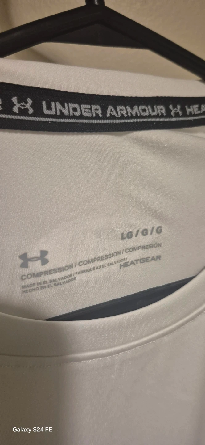 White Under Armour short-sleeve compression t-shirt. HeatGear technology. Size Large. Made in El Salvador.