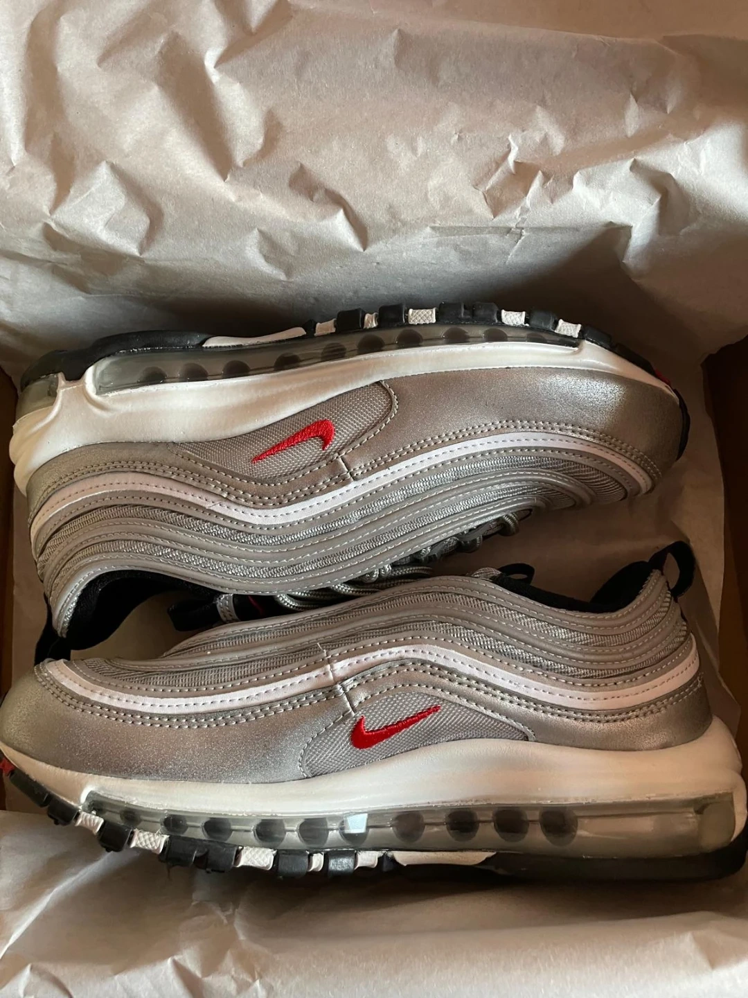 Nike Air Max 97 Silver Bullet sneakers in a women's size 8.5. They're a sleek silver colour with red accents. The original box is included with the shoes.