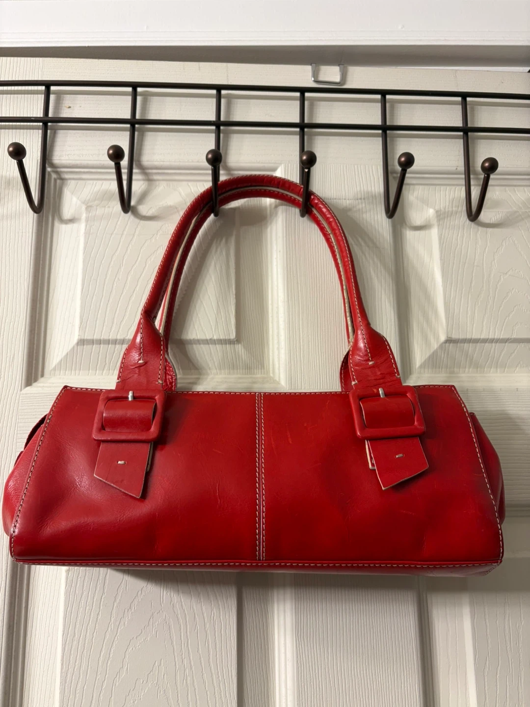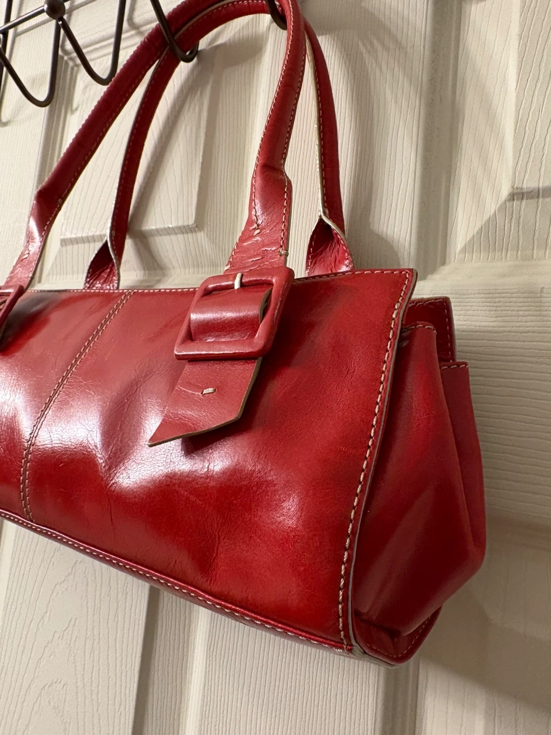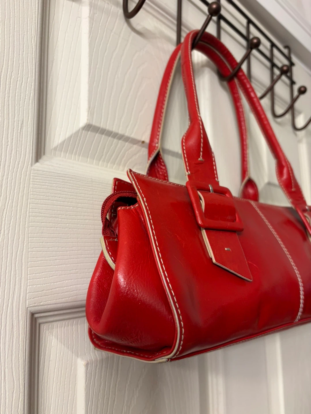 This chic red satchel bag features a glossy leather exterior with white contrast stitching. It's got two buckle details on the front and a zip closure for security. A great everyday bag! Perfect condition, really beautiful piece! Pick up in Chestermere.