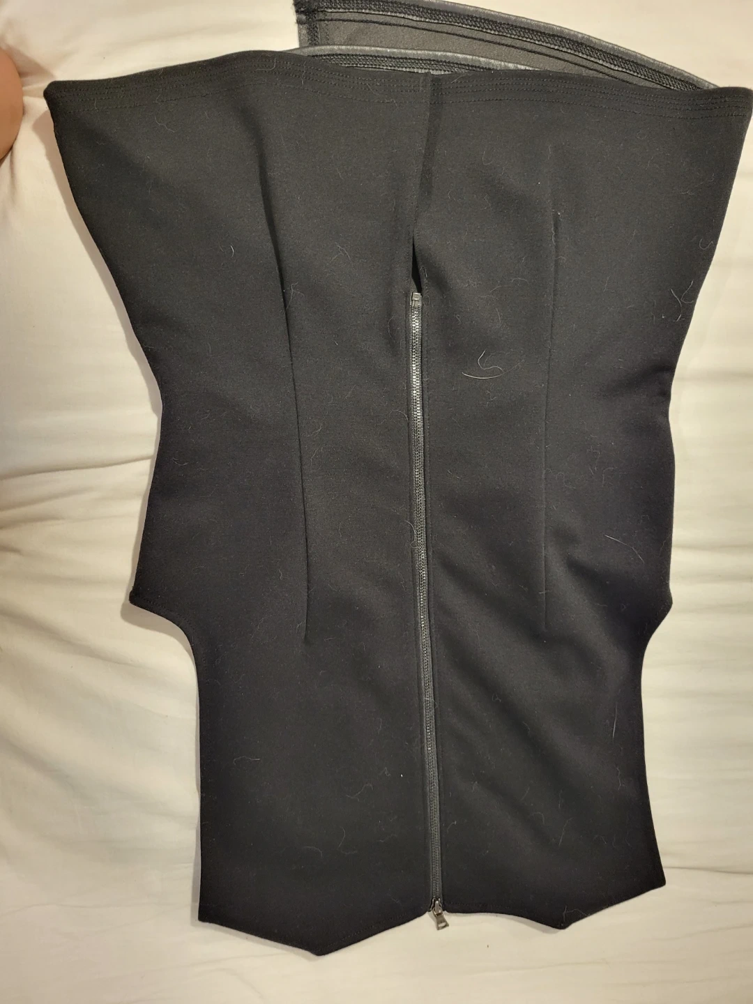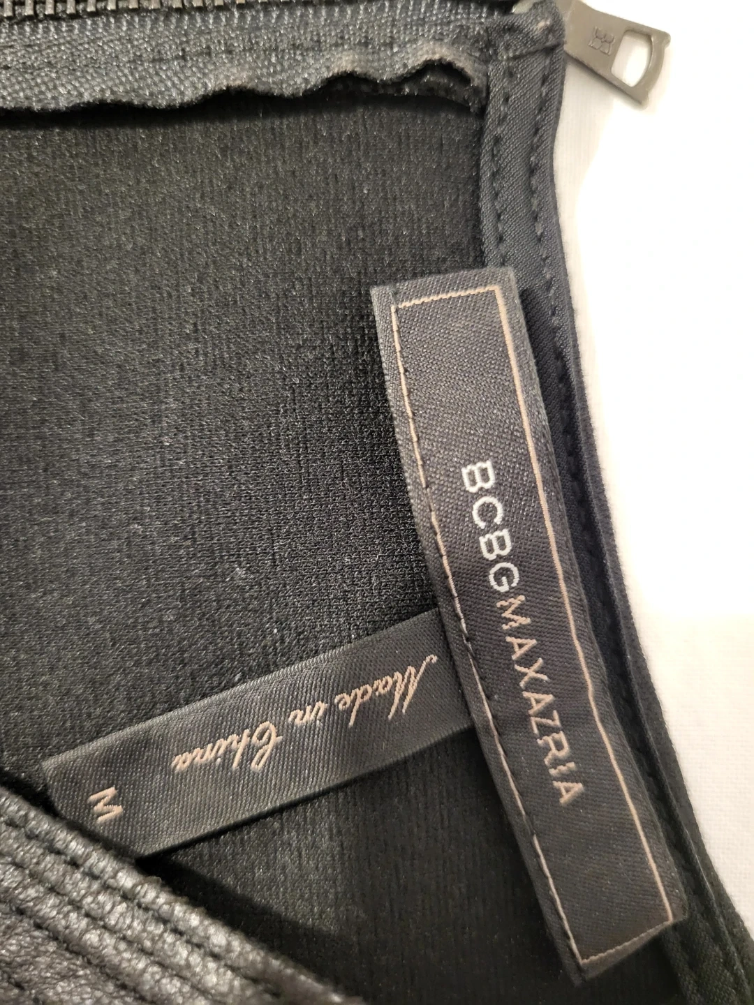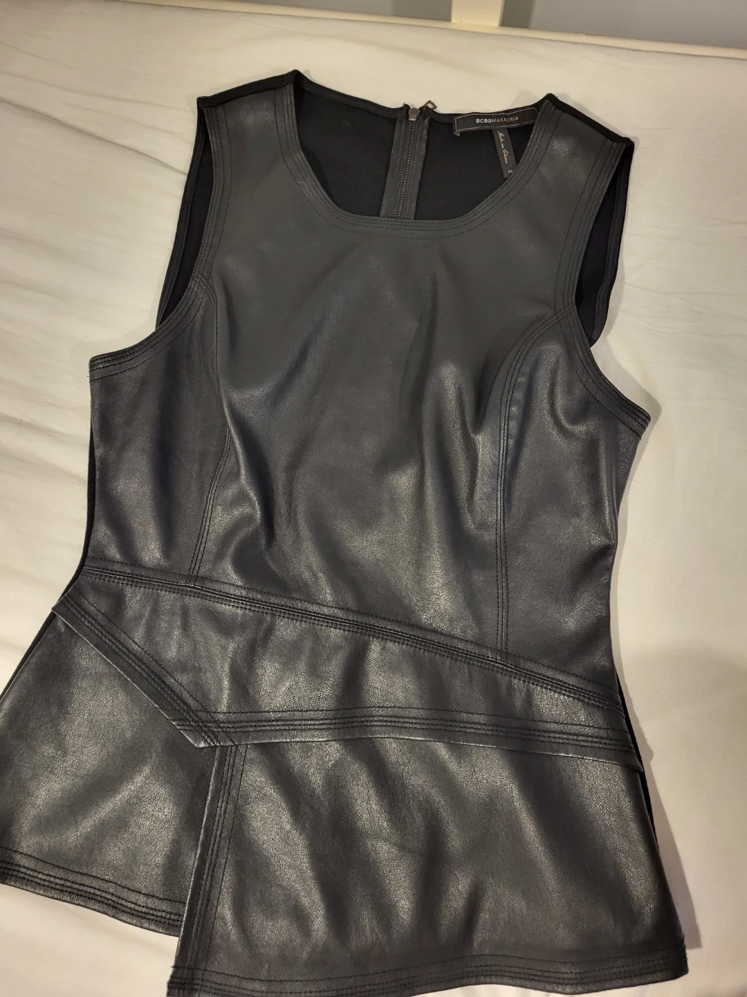 This BCBGMAXAZRIA sleeveless top is black with faux leather detailing. It's a size medium and zips up the back.