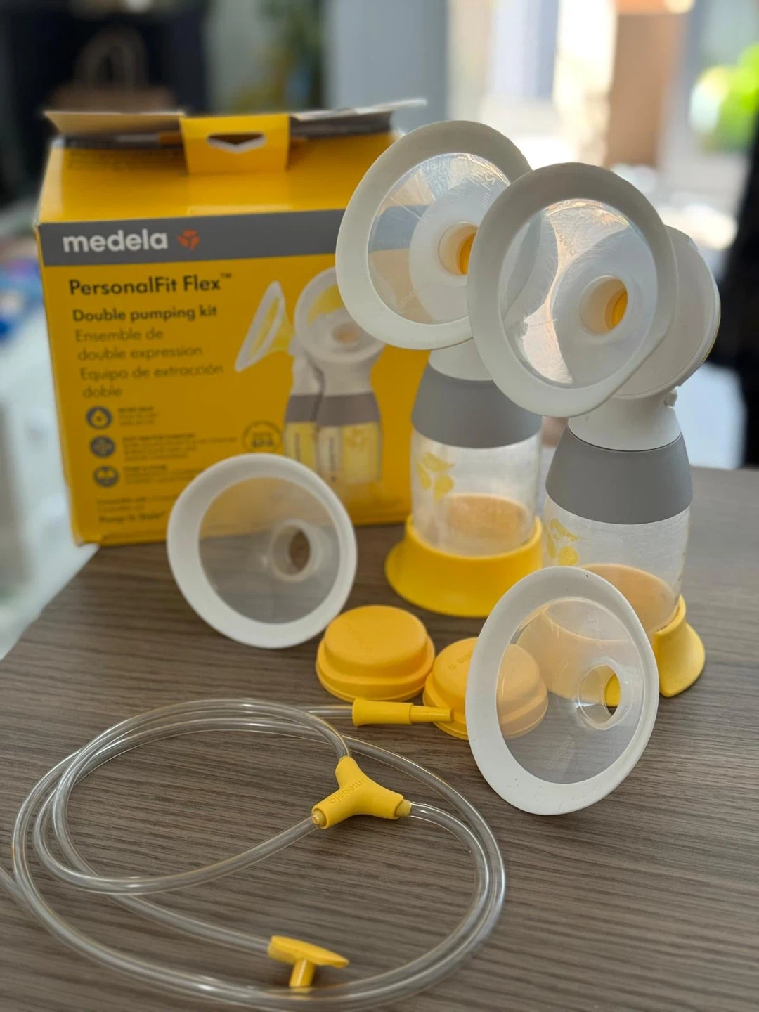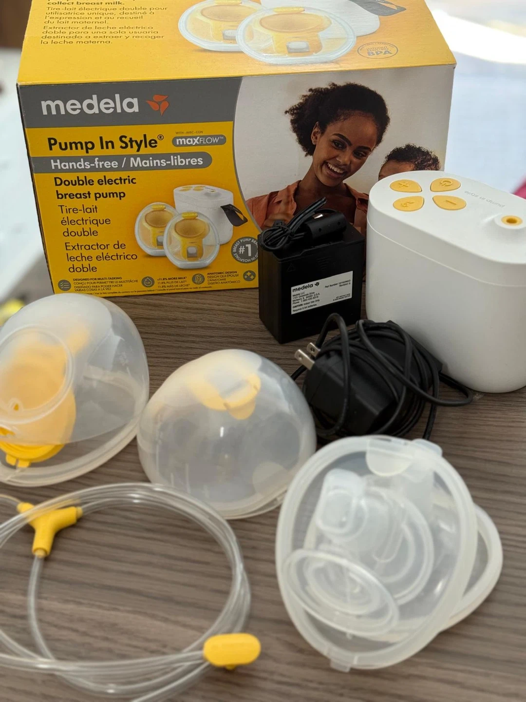 This is a Medela Pump In Style Advanced double electric breast pump. It includes (1) Pump In Style Pro, (2) Hands-free Collection Cups with 24 mm breast shield and O-ring; (2) 21 mm breast shield and O-ring; (1) Complete tubing; (2) Connectors with Membranes, (2) Bottles with Lids, (2) PersonalFit Plus Breast Shields 21 & 24 mm. Used for only for couple of days. Sanitized and kept.