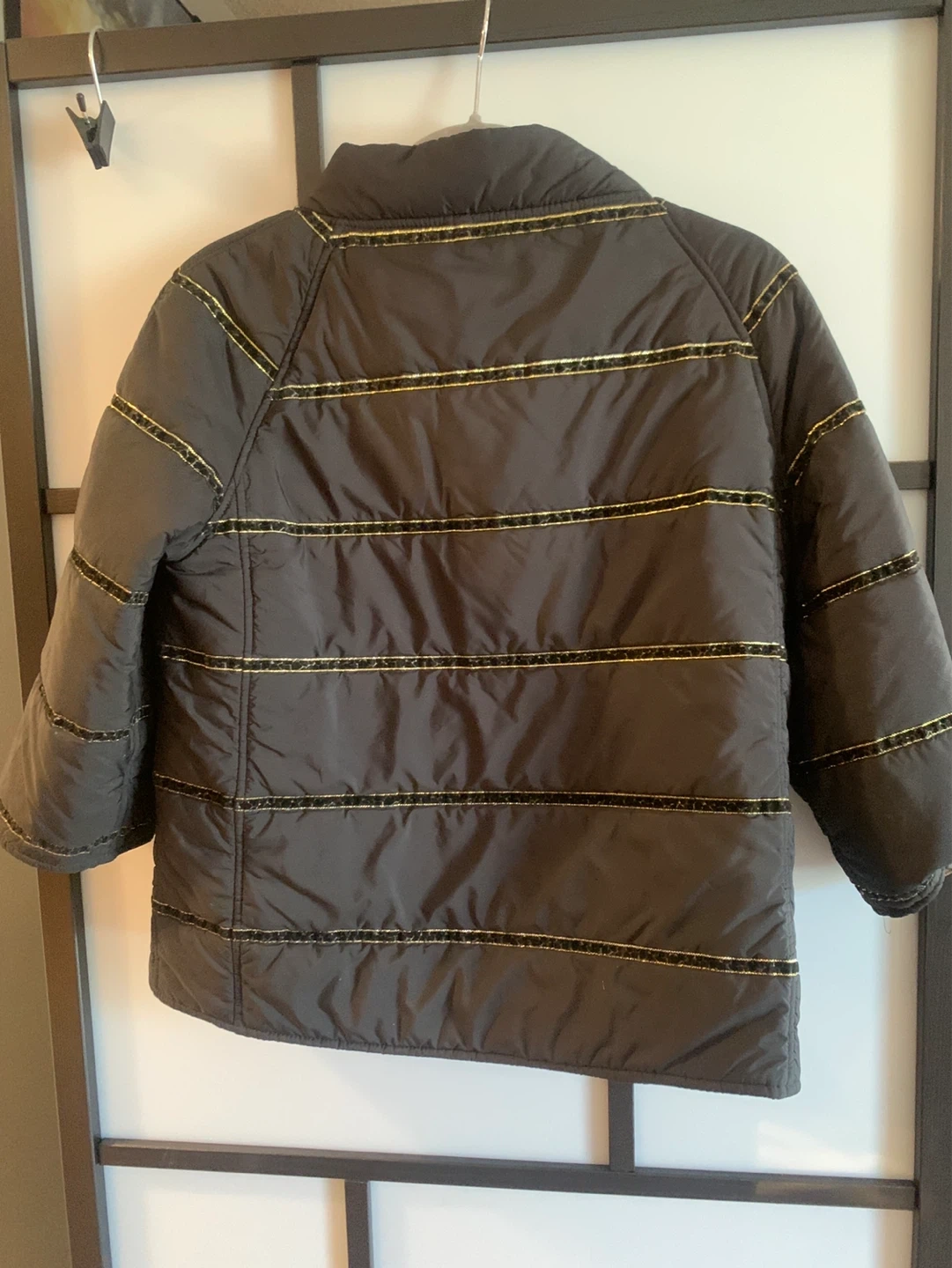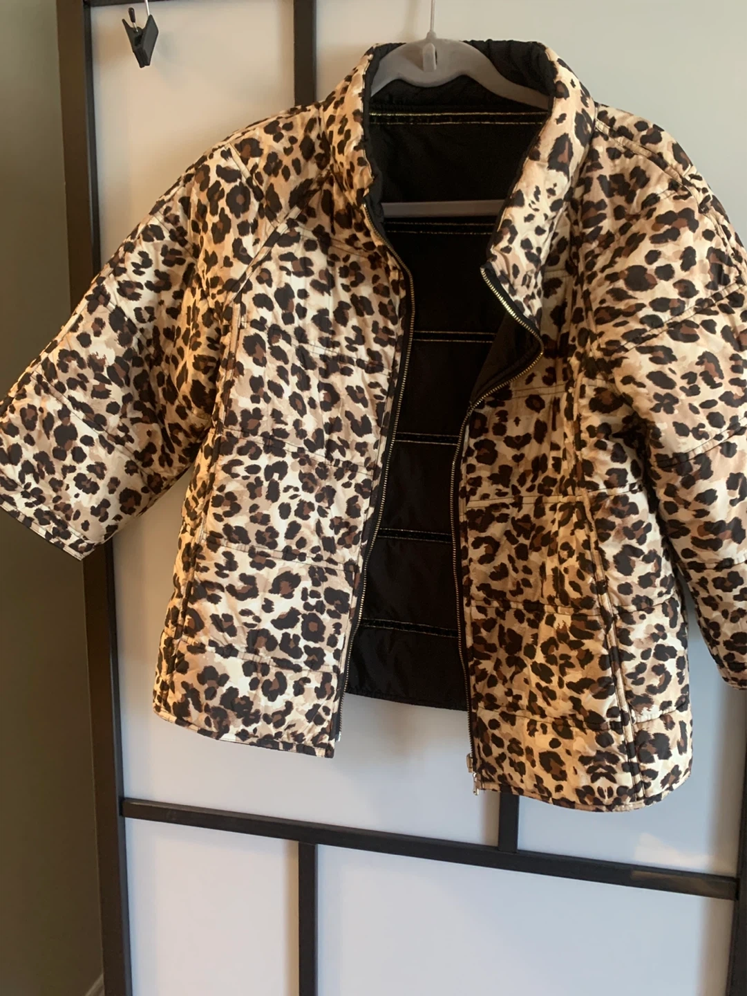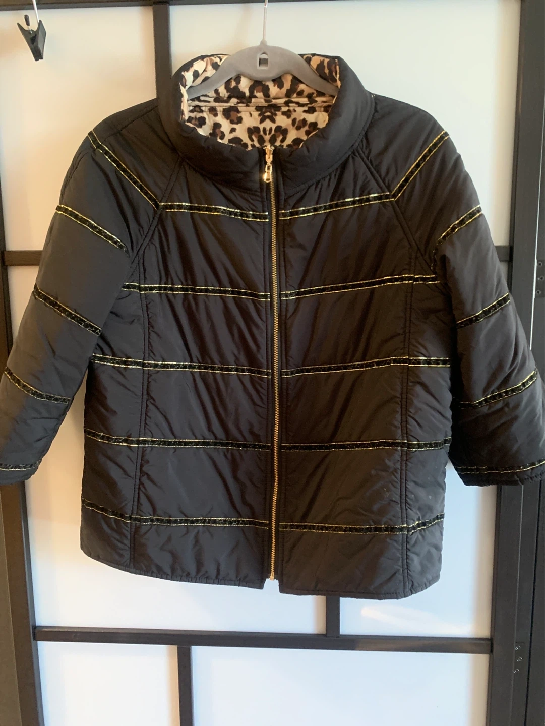 Reversible puffer jacket featuring a fun leopard print on one side and a black design with gold stripe accents on the other. It's a stylish outerwear option !