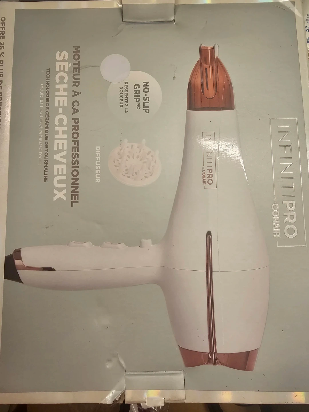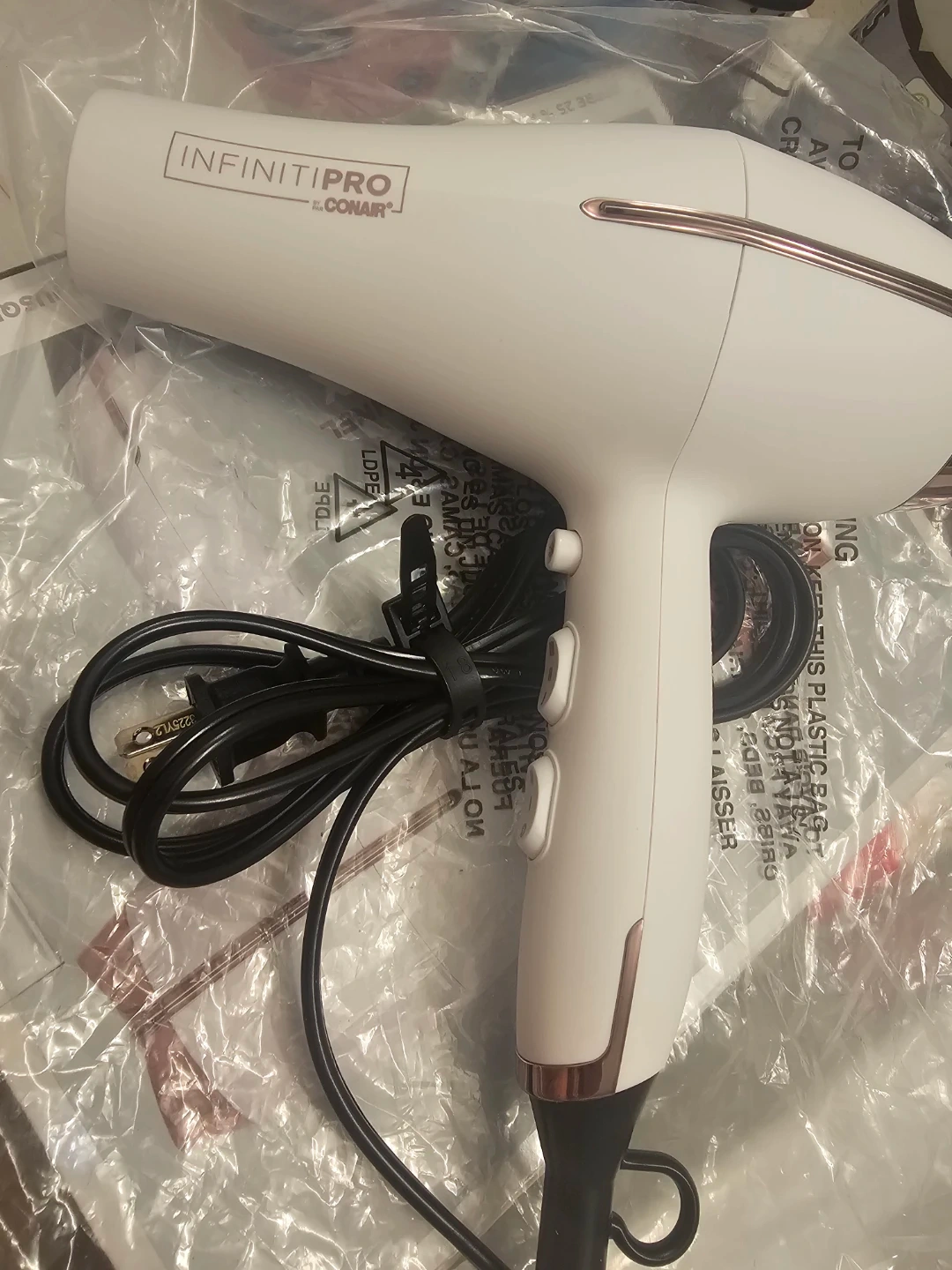 This InfinitiPro hair dryer by Conair comes with a diffuser attachment. It features ceramic tourmaline technology for reduced frizz. The professional motor ensures powerful drying.