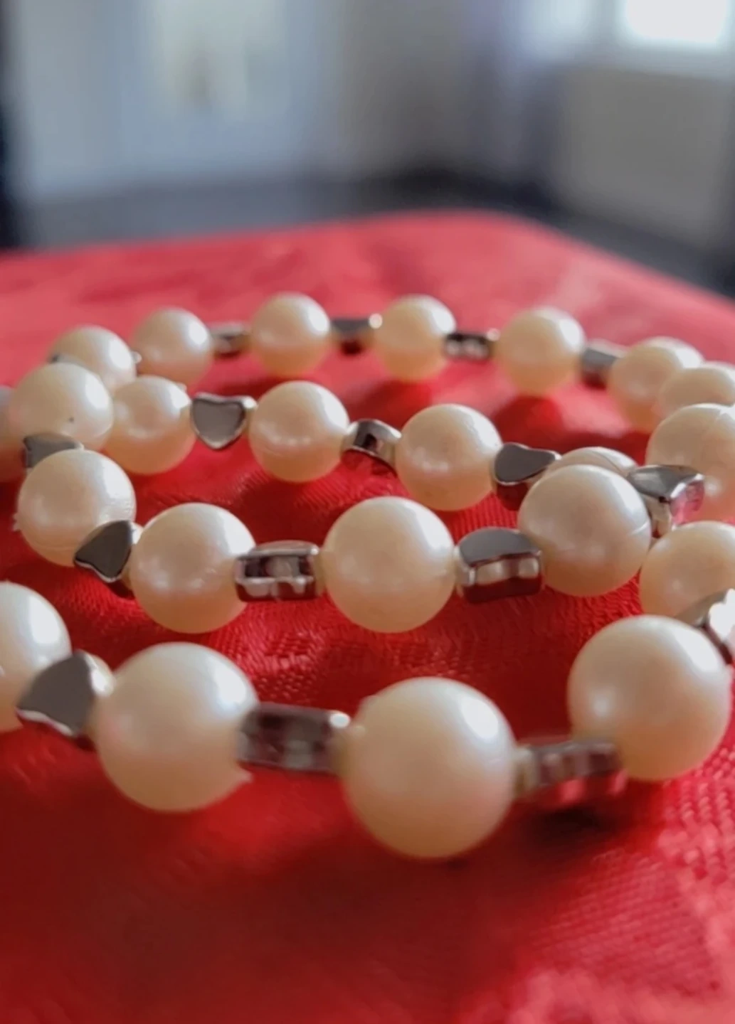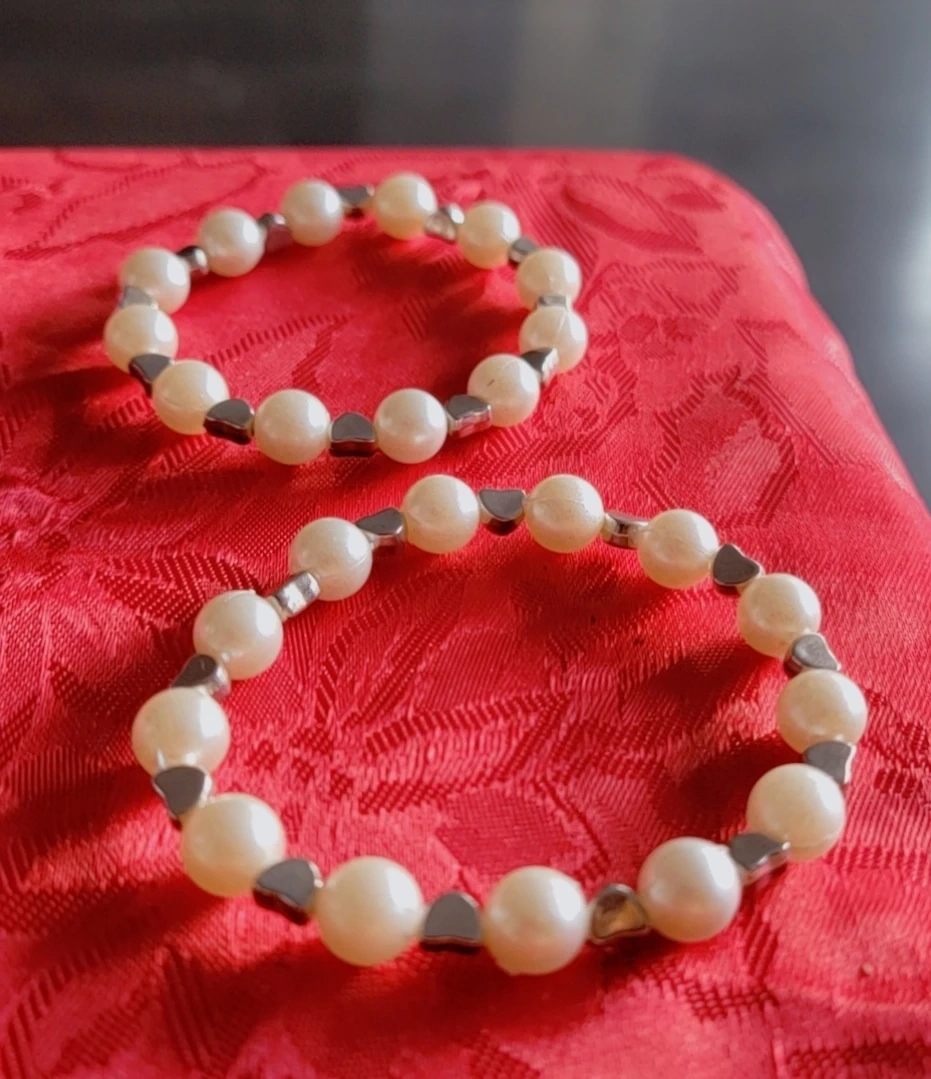 Two elastic bracelets feature faux pearl beads and small silver-tone heart charms. Simple and sweet accessory for everyday wear. Stretch fit makes them easy to put on and take off.