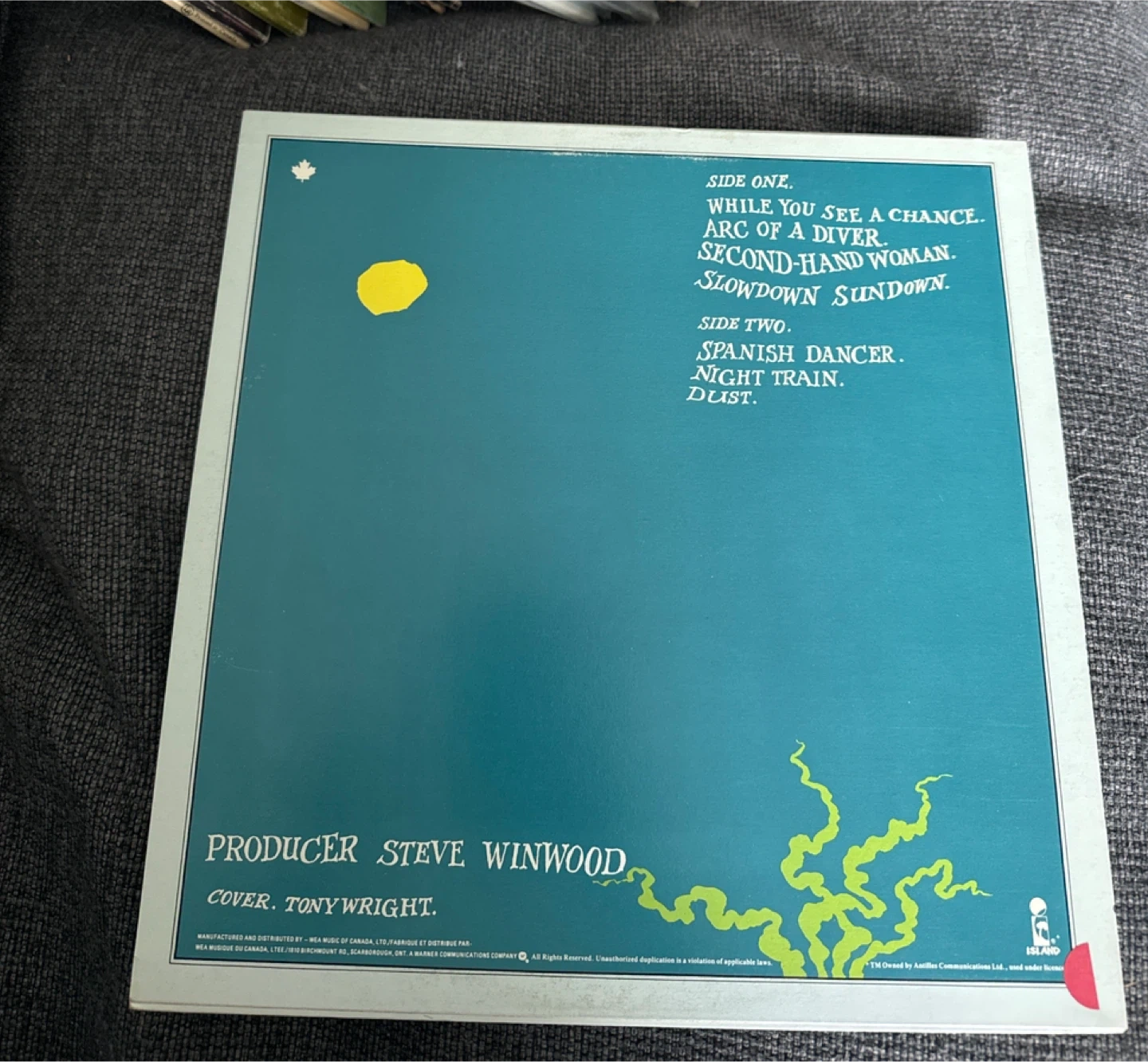 Steve Winwood's 1980 album, Arc of a Diver. Features tracks like 'Spanish Dancer' and 'Slowdown Sundown'. This is a vinyl LP.