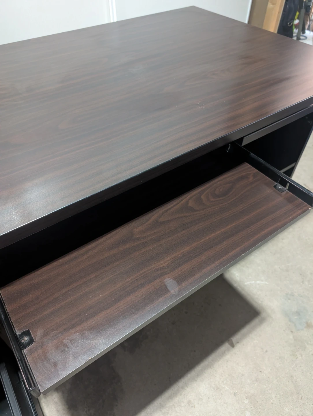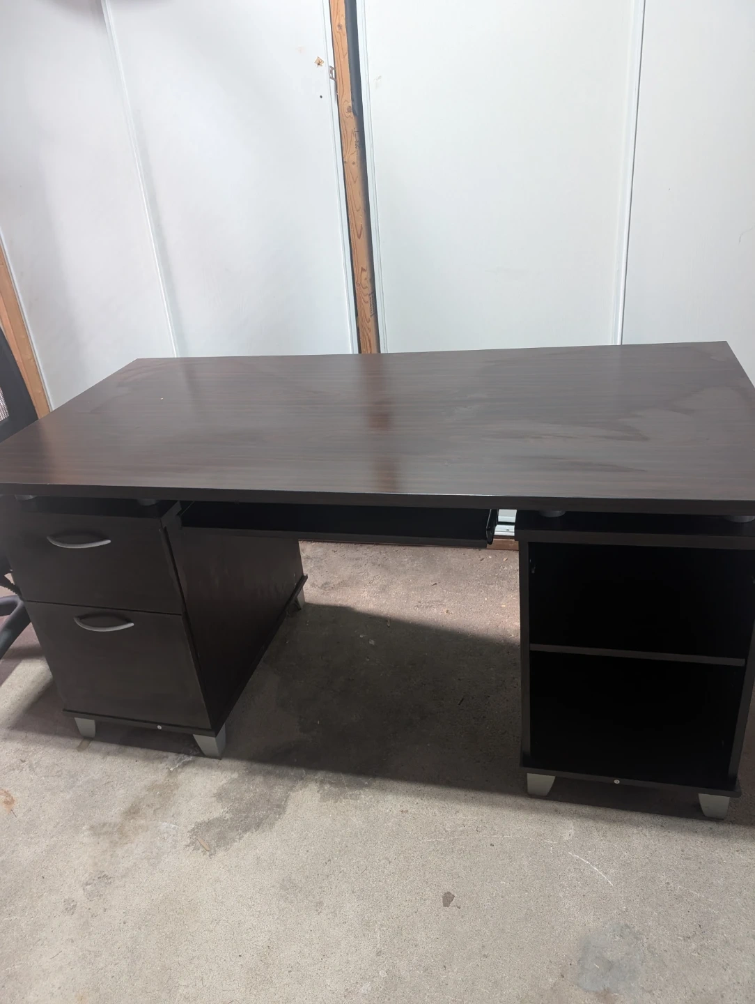 This is a dark brown desk with two drawers and a pull-out keyboard tray. It also has an open shelving unit on the side. Has a little chip on the top. The top small drawer on the right is missing but it's barely noticeable. It's a heavy solid piece of furniture. 150x75x75cm