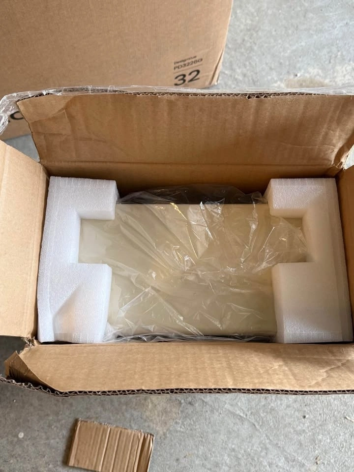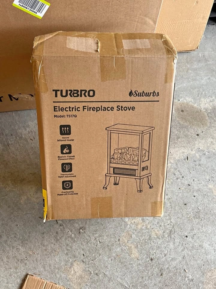New TURBRO electric fireplace stove, still in box. Features a 1500W infrared heater with realistic flame and firewood effect. Includes thermostatic temperature adjustment and overheating power-off protection.