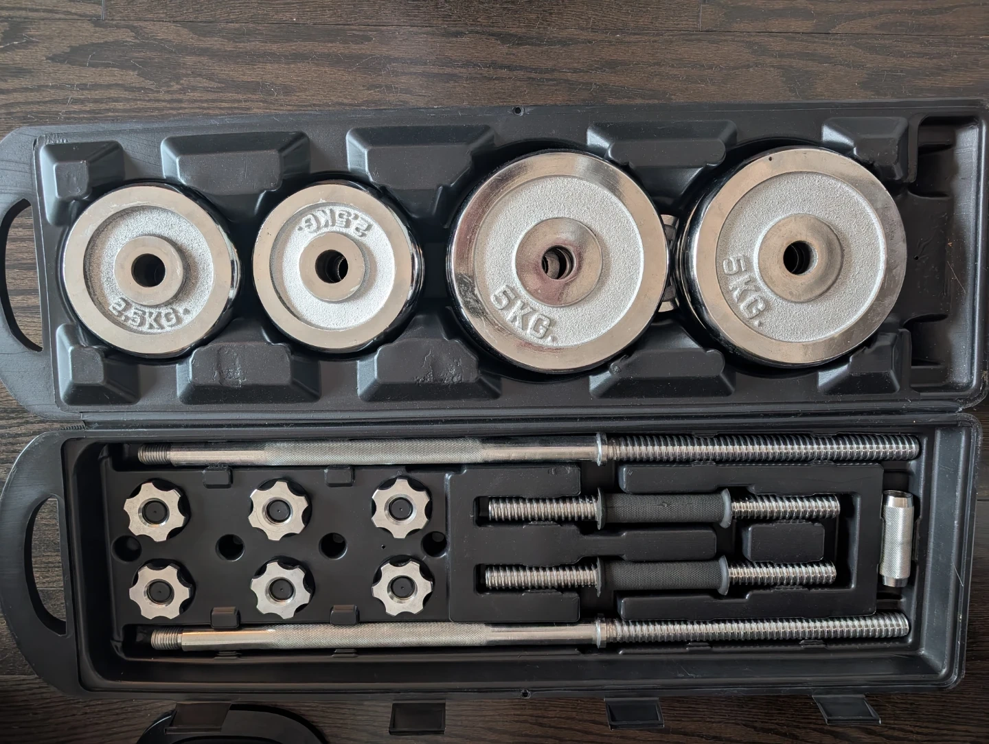 This 50kg chrome barbell and dumbbell set comes with multiple weight plates. The set includes one barbells, two dumbbells, and spin locks. All pieces store neatly in the included carrying case with wheels.