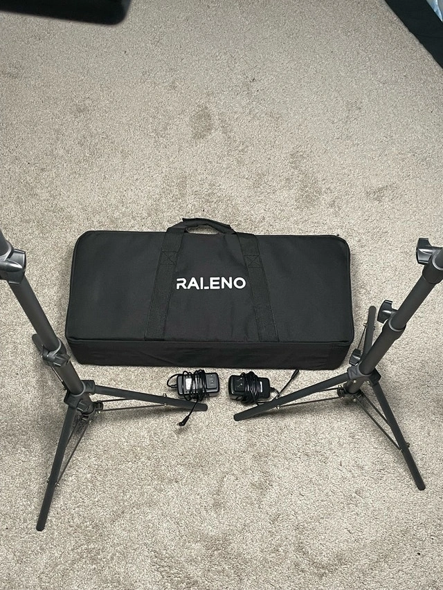 2 PACK RALENO Video Lighting Kit is in Perfect condition. Great lights for YouTube videos, been using for less than 2 years, selling as I don’t film videos that often anymore. Comes with all parts as listed on Amazon: 2 Video Lights, 2 Stands, 2 Adapters, 2 Cold shoes and 1 Stand. Came with a clamp too but it doesn’t say on the Amazon Listing